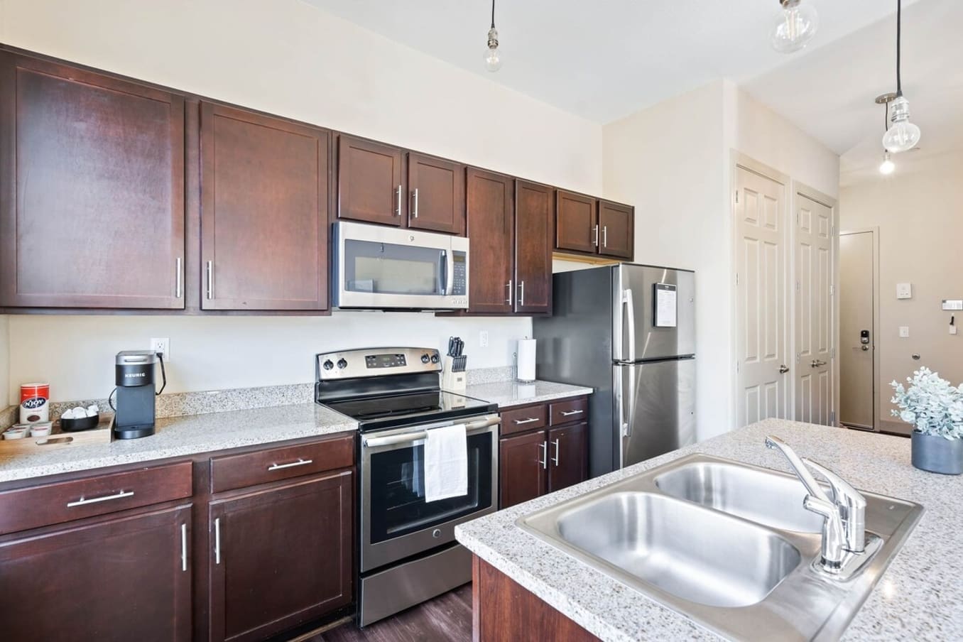 Upon arrival, you’ll be greeted by a stylish lobby that sets the tone for your stay. After parking your vehicle securely in the garage below. With the convenience of a smartlock code, you’ll enter your apartment, setting the stage for a seamless and enjoyable experience.