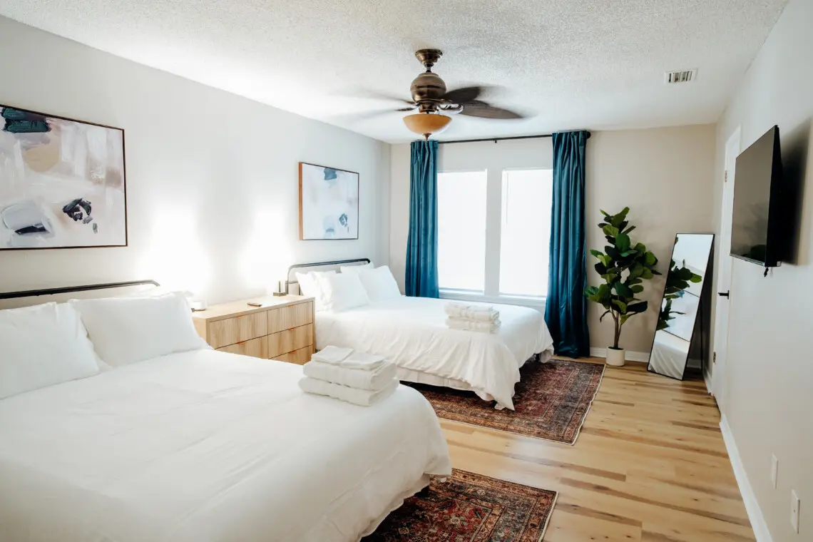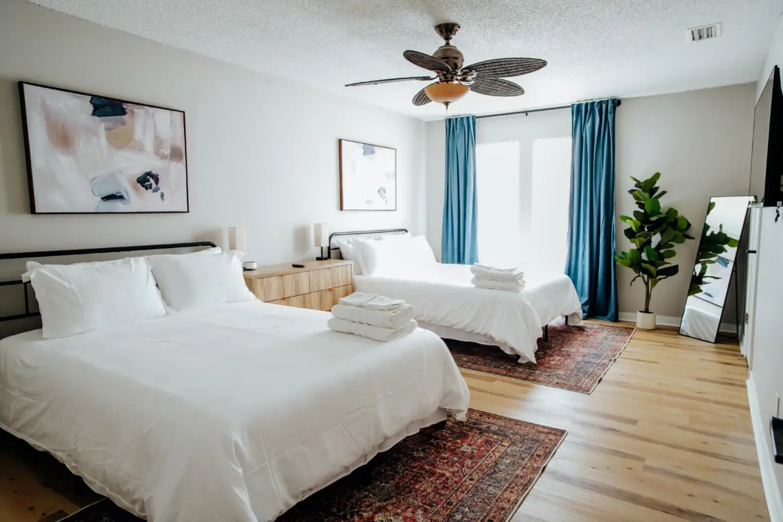The front bedroom is a haven of comfort, offering ample space, a smart TV, and two queen beds with brand-new memory foam mattresses for dreamy nights of rest. Across the hall, the back bedroom presents a king bed and another TV for ultimate relaxation.