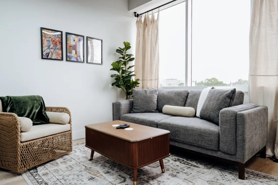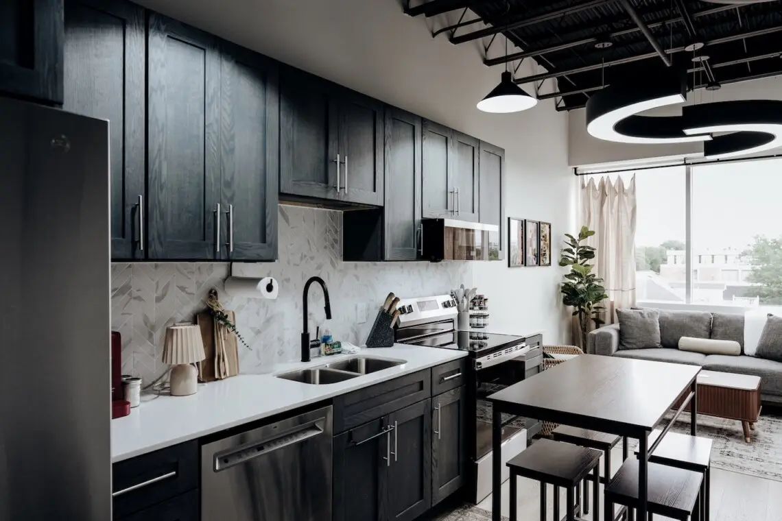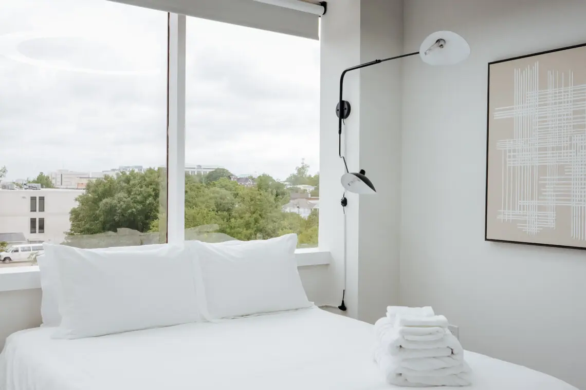 Step into comfort and style as you arrive at this beautifully designed downtown Montgomery apartment. Upon entering the front door, the elevator is conveniently located to your left. Ride up and step into a bright, thoughtfully curated space, where professional interior design and modern luxury set the tone for your stay.