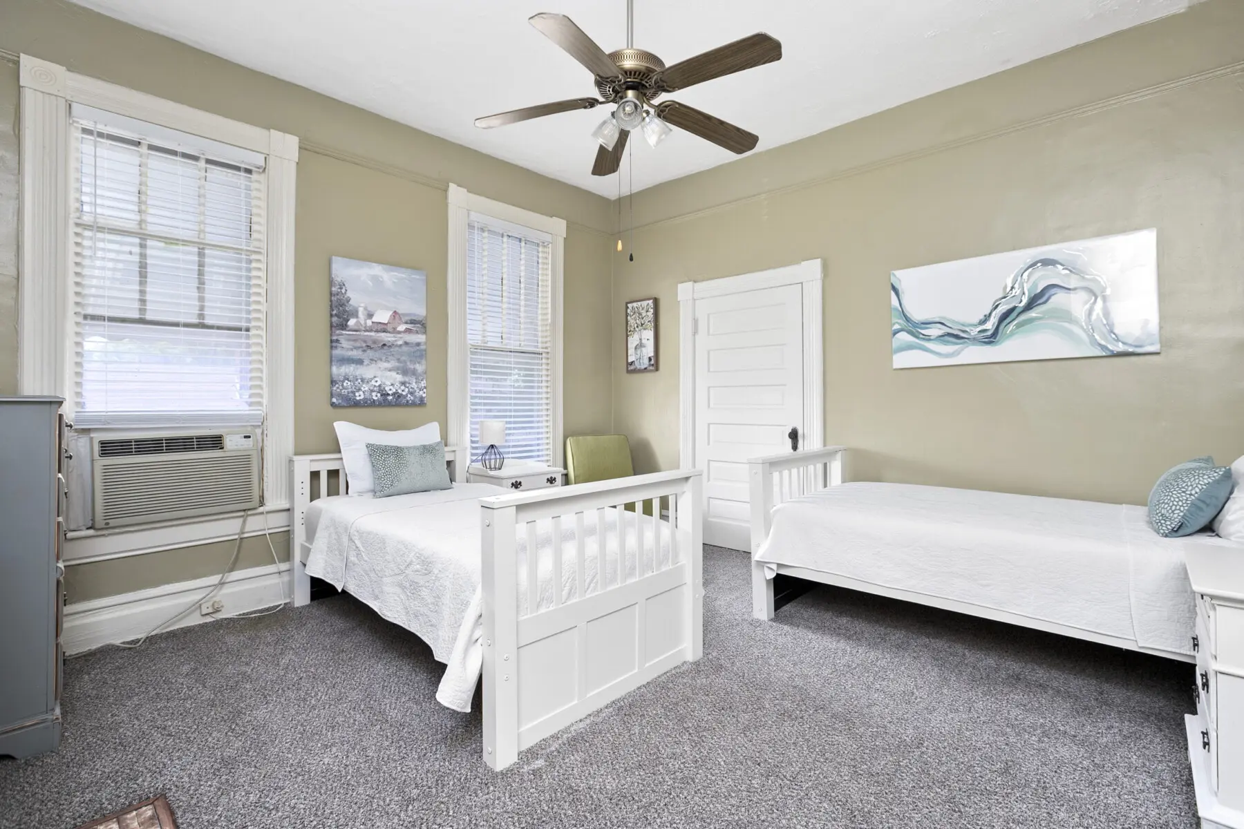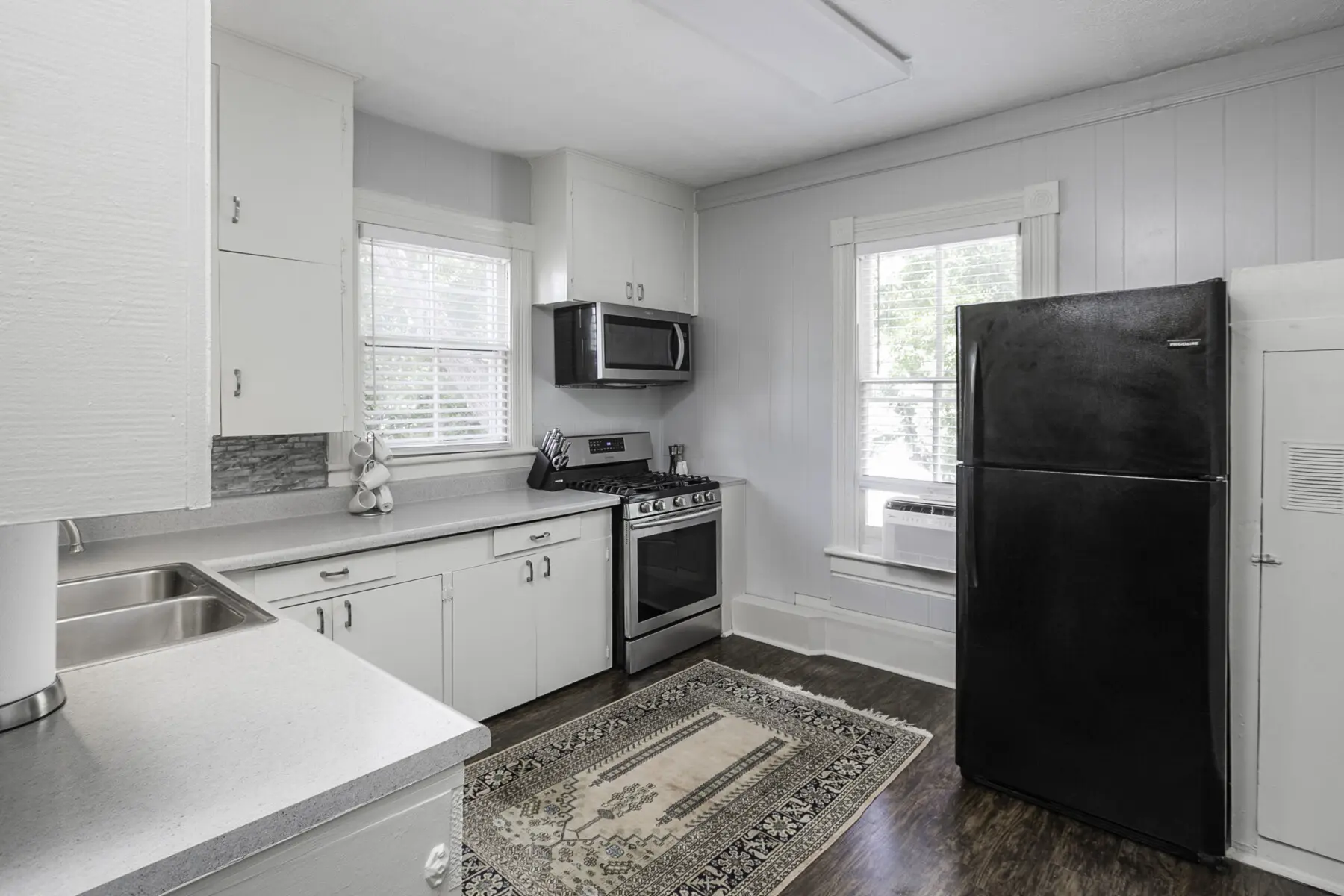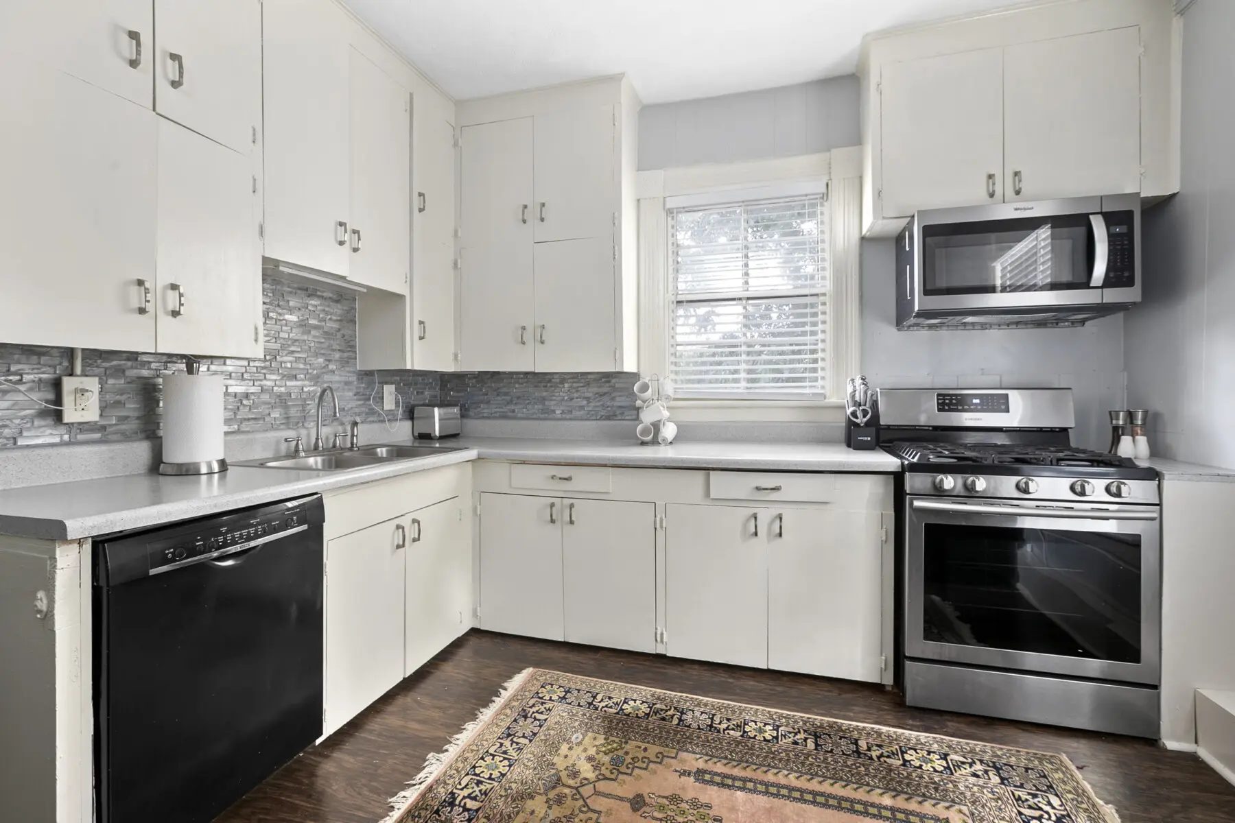 There are entrances both in the back and the front of this listing. The back staircase leads directly into the restored kitchen where we’ve placed stainless appliances, new paint, counters, and backsplash. The front staircase leads up to the front patio where we have seating for four. Just inside is the living room and comfortable seating. This connects with the dining room which is the central point of the listing. All three bedrooms and kitchen connect to it.