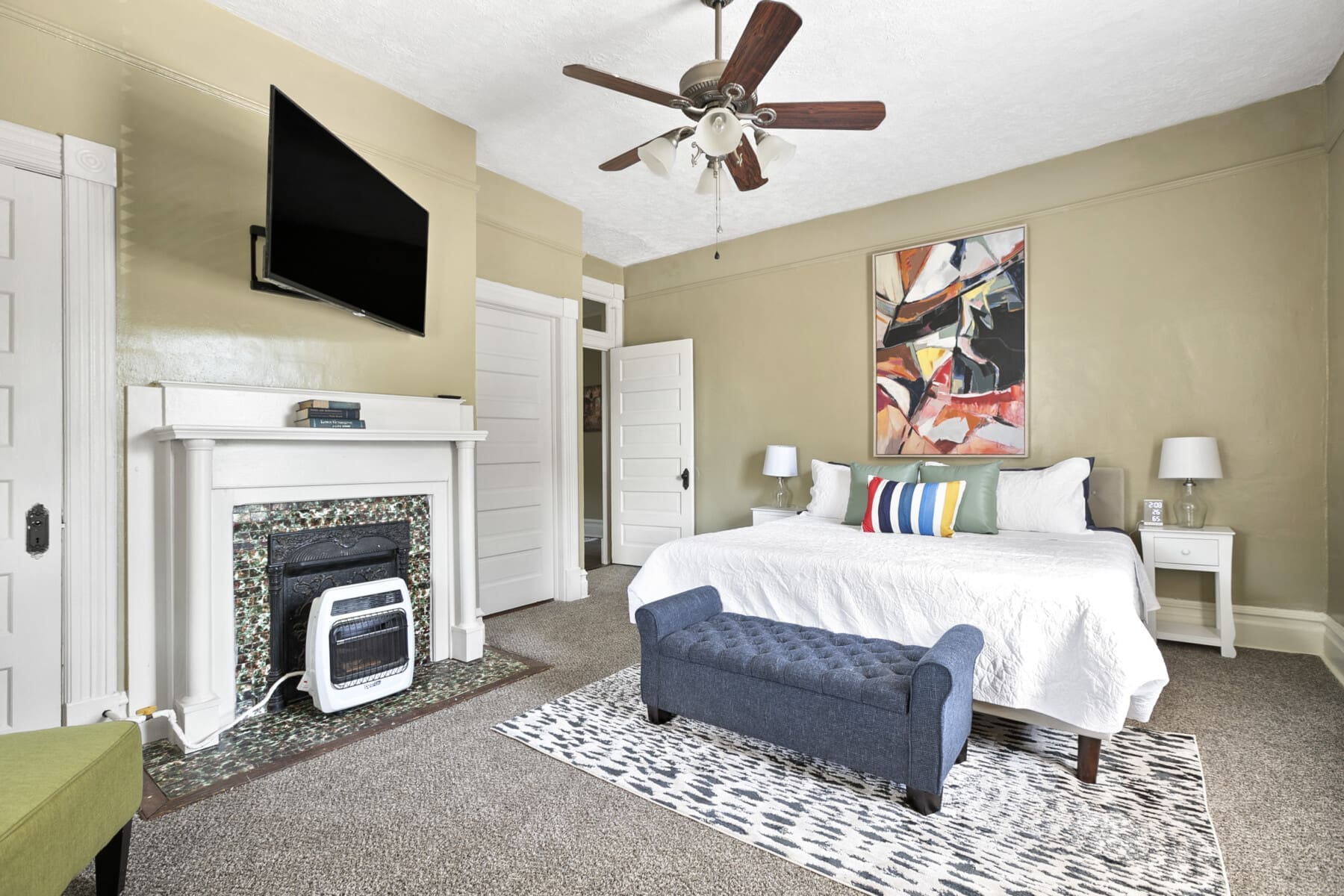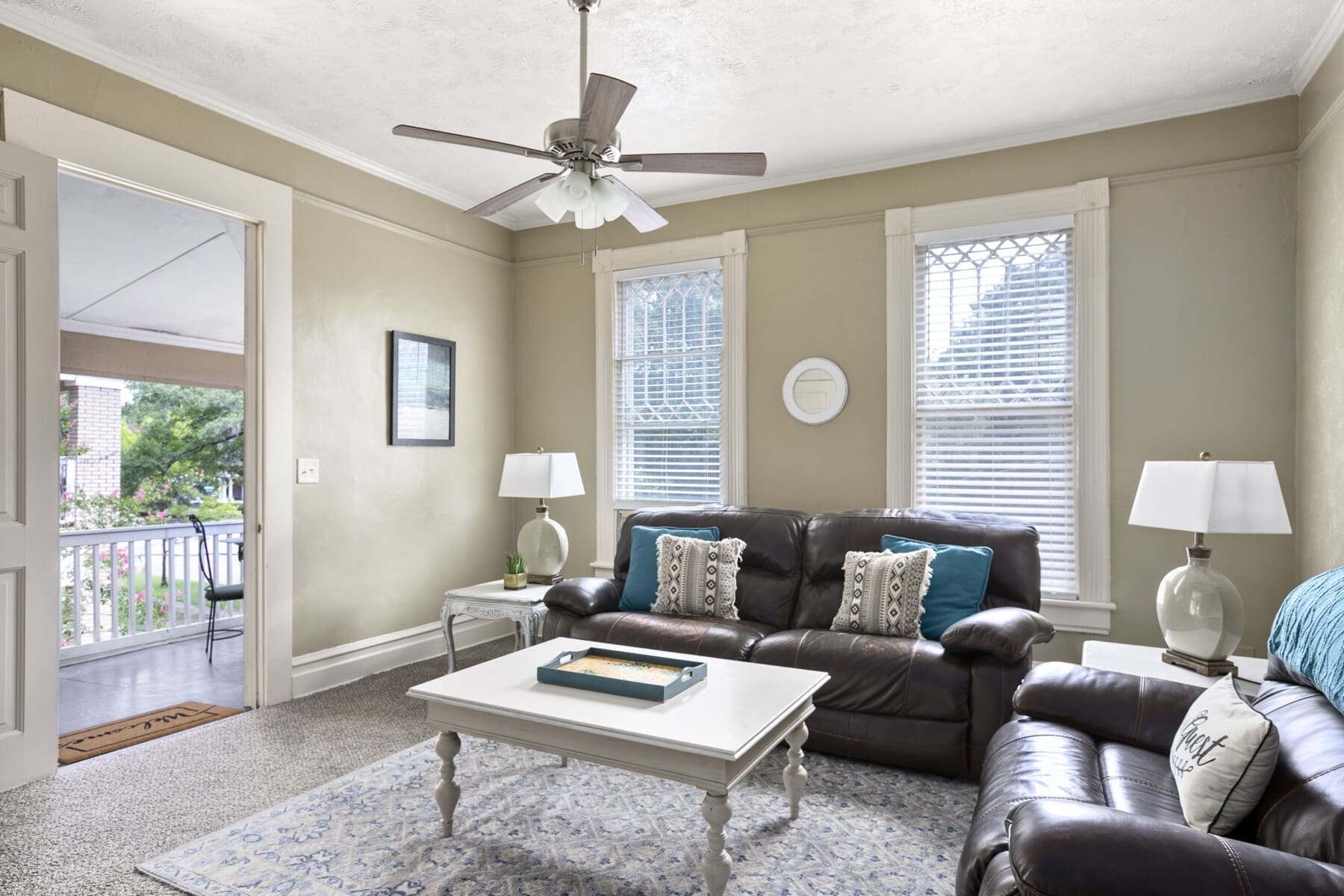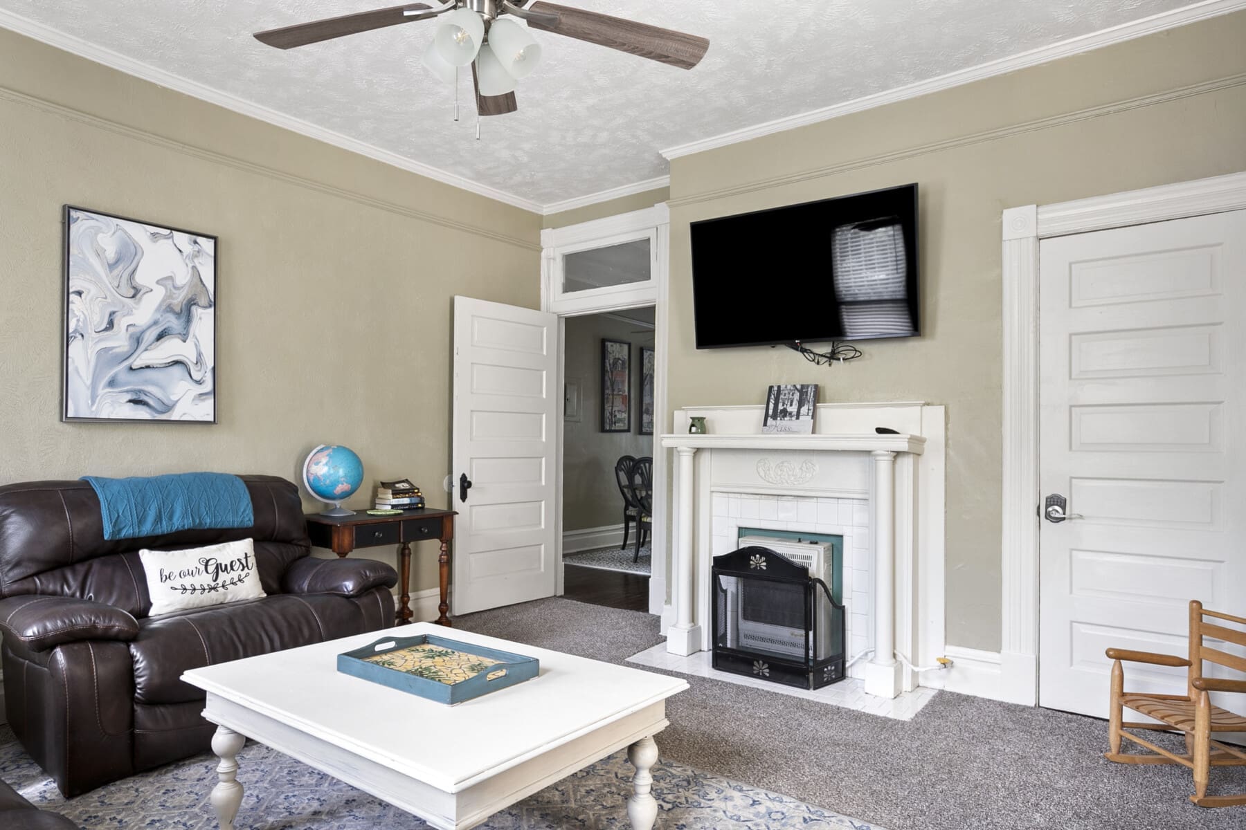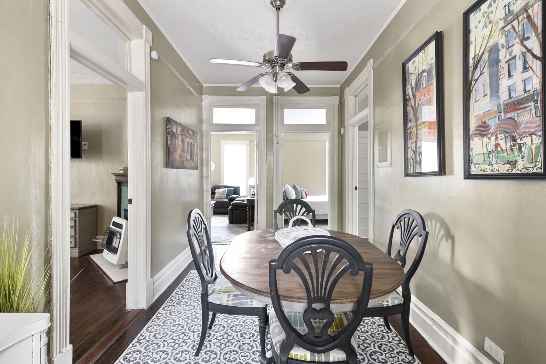 There are entrances both in the back and the front of this listing. The back staircase leads directly into the restored kitchen where we’ve placed stainless appliances, new paint, counters, and backsplash. The front staircase leads up to the front patio where we have seating for four. Just inside is the living room and comfortable seating. This connects with the dining room which is the central point of the listing. All three bedrooms and kitchen connect to it.