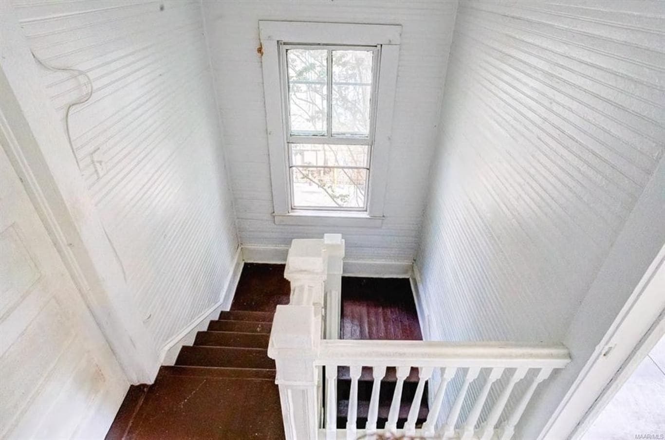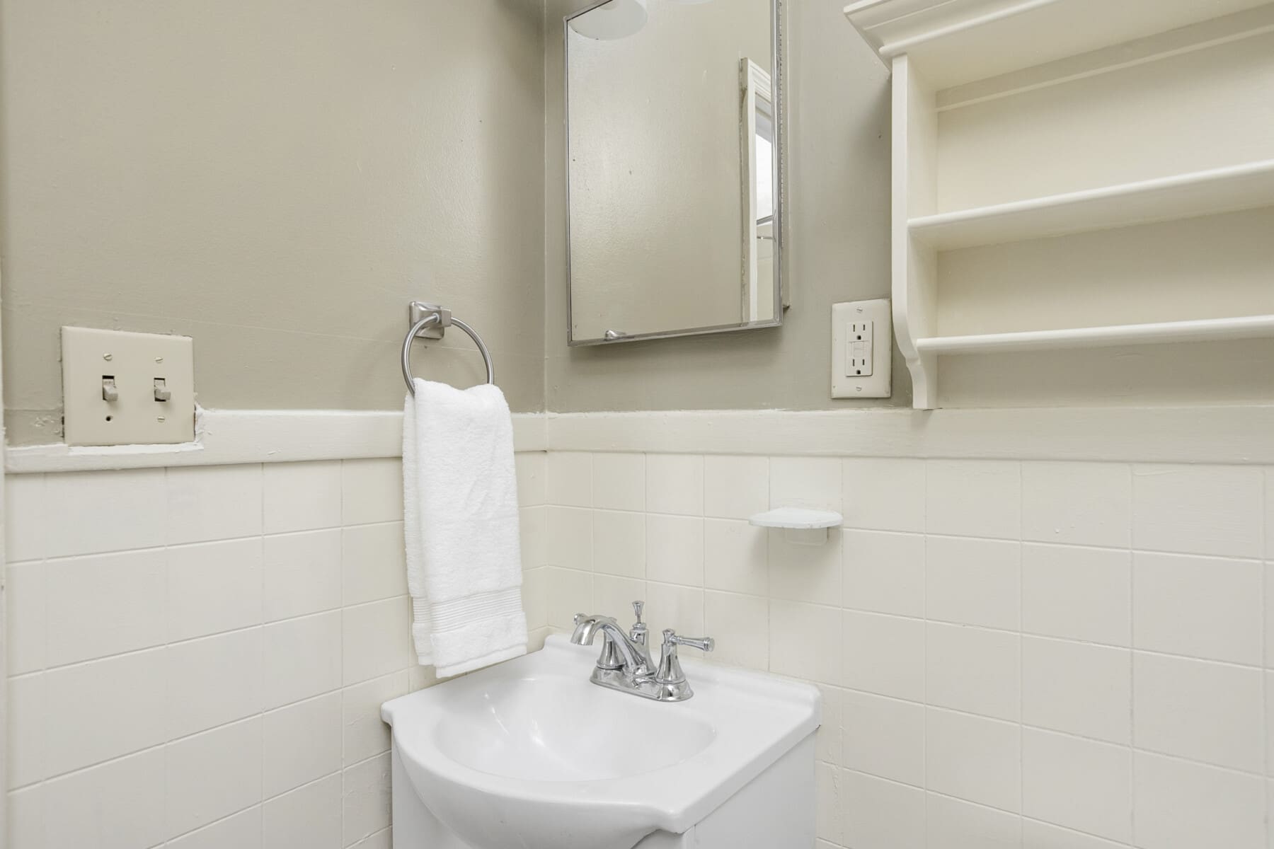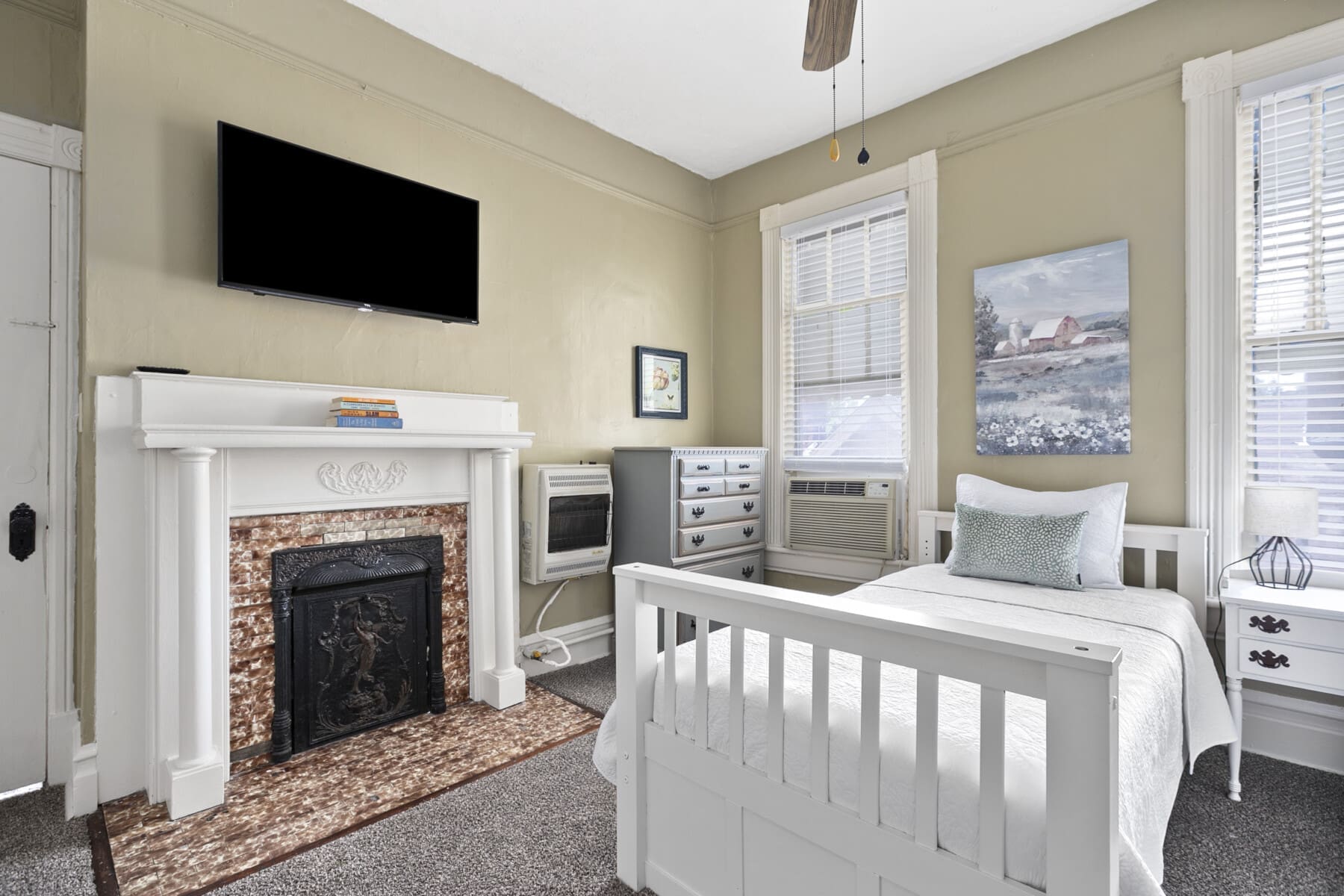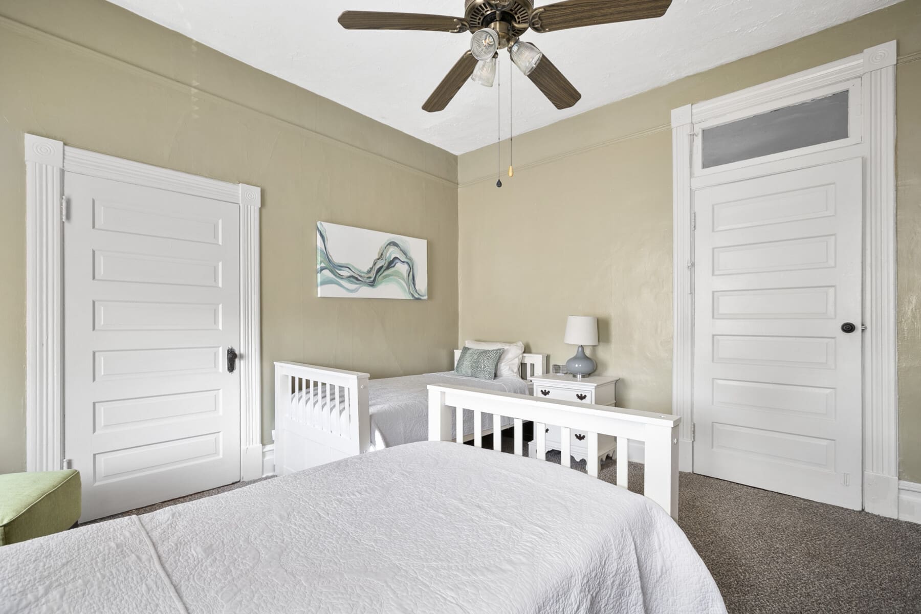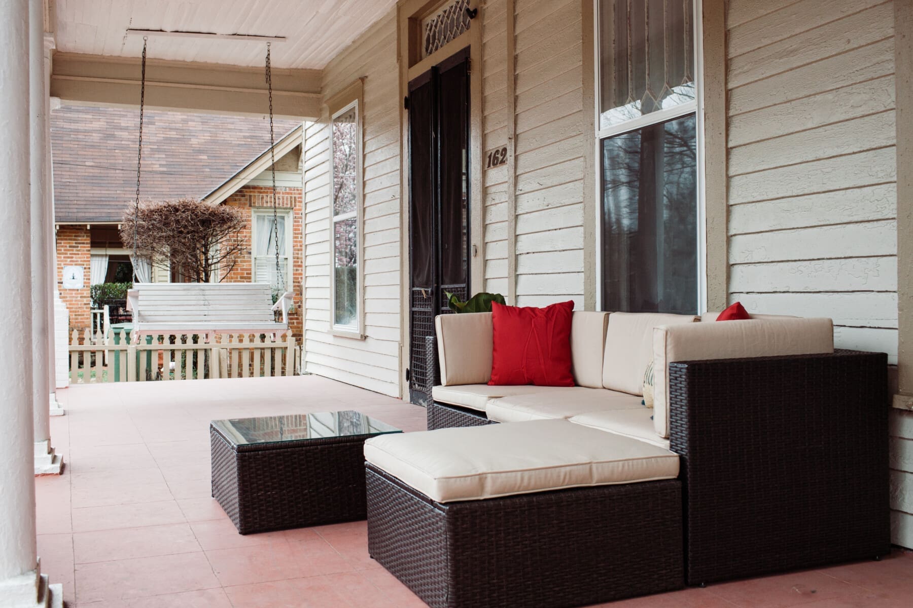 There are entrances both in the back and the front of this listing. The back staircase leads directly into the restored kitchen where we’ve placed stainless appliances, new paint, counters, and backsplash. The front staircase leads up to the front patio where we have seating for four. Just inside is the living room and comfortable seating. This connects with the dining room which is the central point of the listing. All three bedrooms and kitchen connect to it.