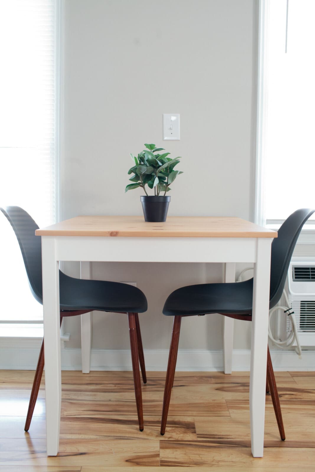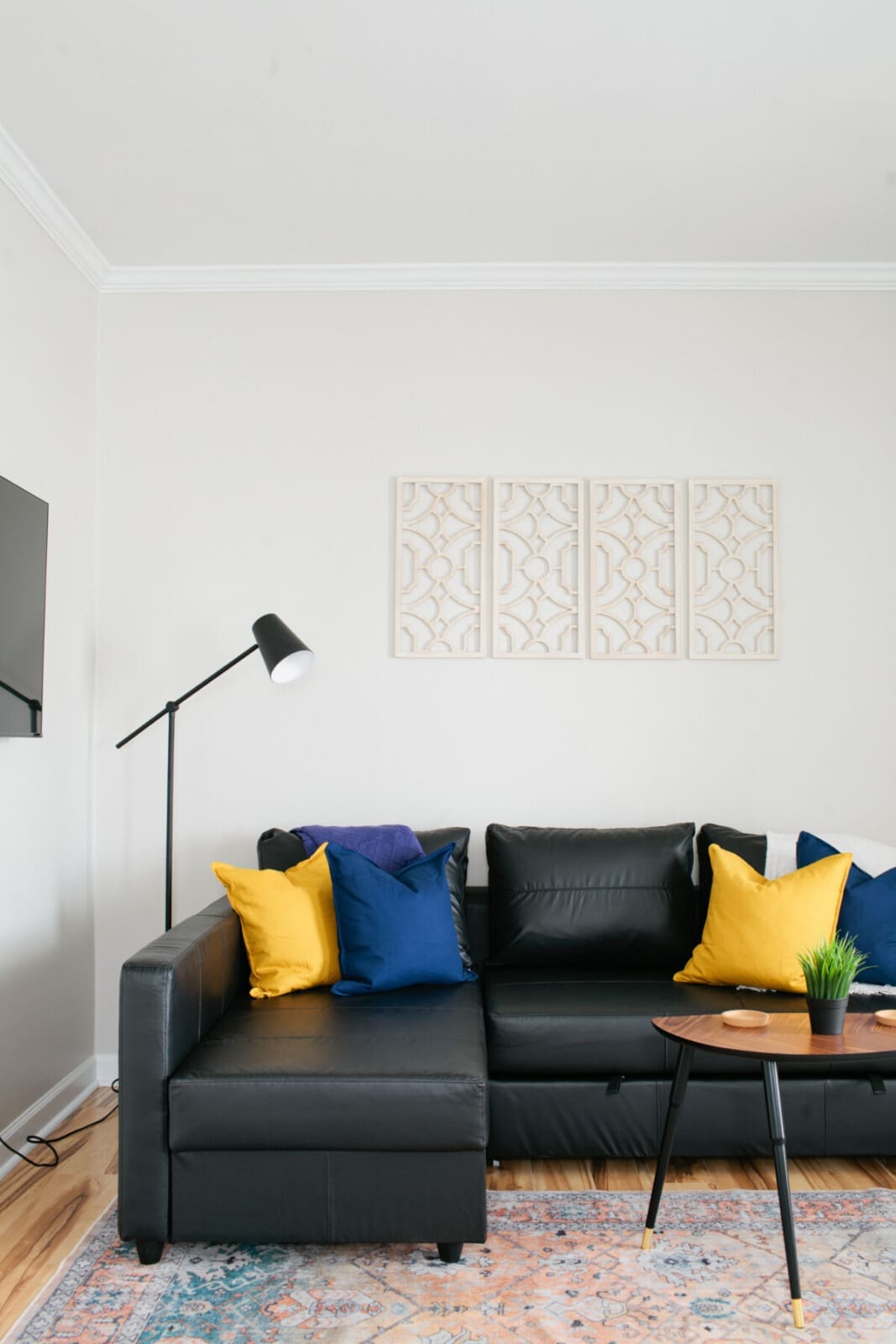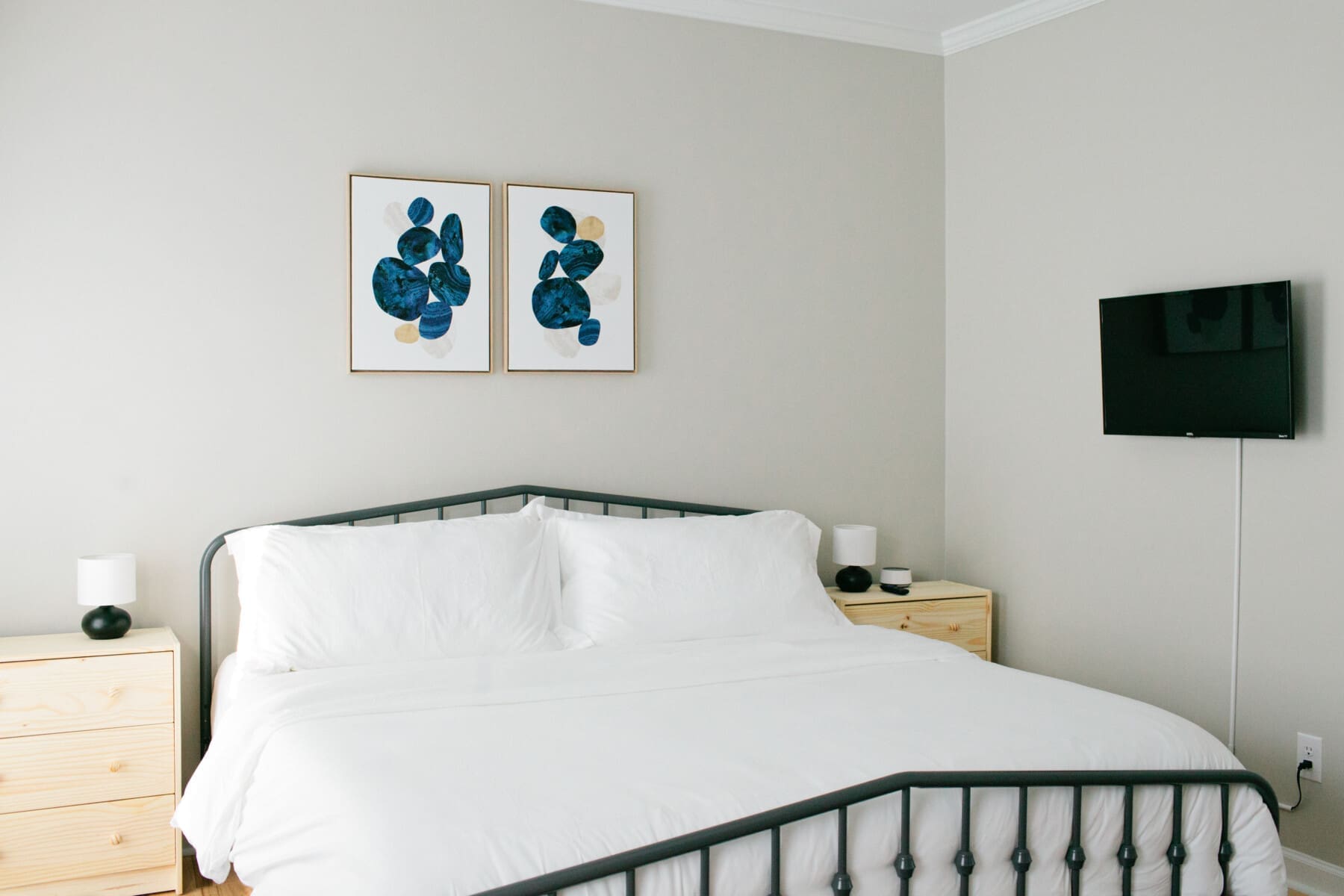 Through the door, you’ll find the private king bedroom and bathroom, where you can relax and unwind after a long day. The bedroom is furnished with modern furniture, adding to the overall contemporary feel of the apartment. The bathroom is pristine, with new fixtures and finishes throughout.