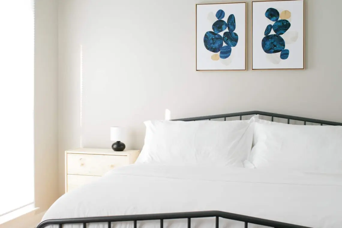 Through the door, you’ll find the private king bedroom and bathroom, where you can relax and unwind after a long day. The bedroom is furnished with modern furniture, adding to the overall contemporary feel of the apartment. The bathroom is pristine, with new fixtures and finishes throughout.