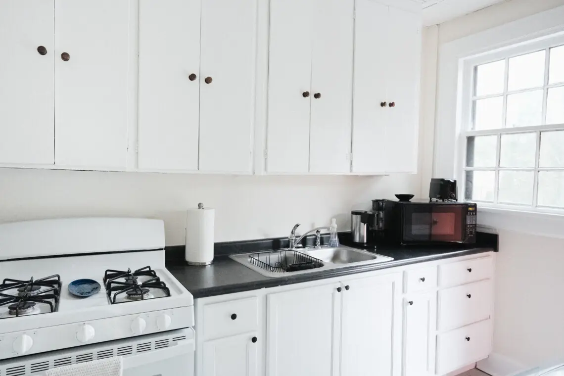 You’ll enter through the front door, up the outdoor stairs, and step into the cozy living room, complete with comfortable seating and a smart TV for your entertainment. To the right, a staircase leads to the upstairs bedrooms, while the dining room and kitchen are located at the back of the home. The kitchen is fully equipped with brand-new appliances, including a washer and dryer, and offers everything you need to prepare meals during your stay. A secondary back door in the kitchen provides additional access once you’re inside.