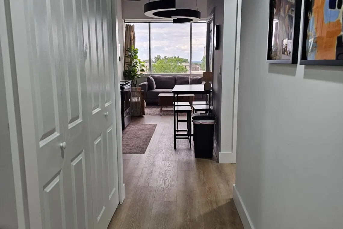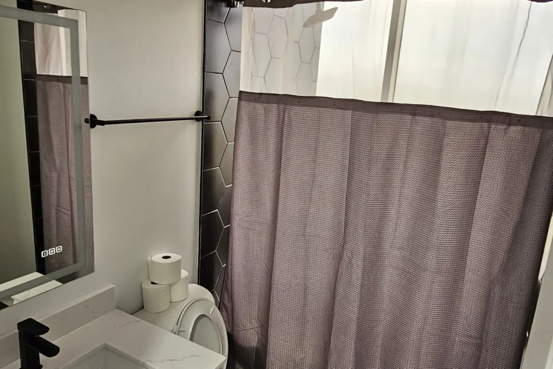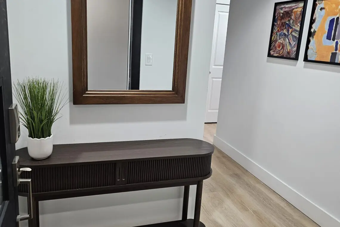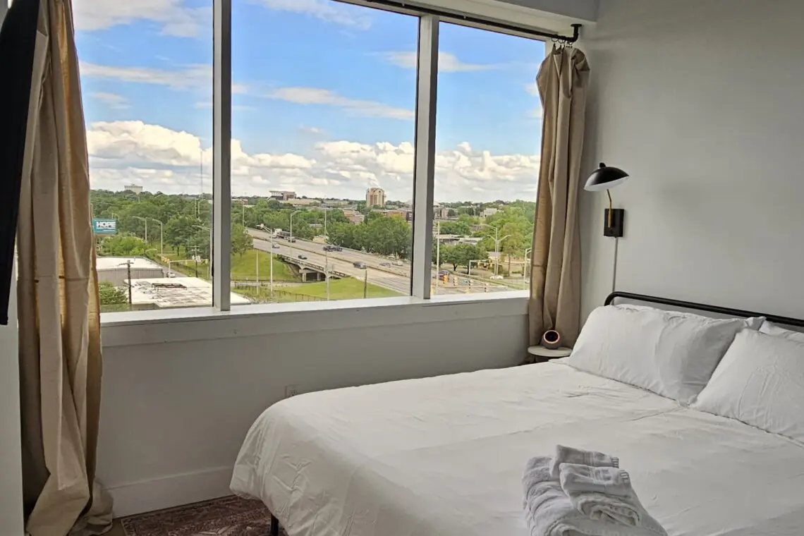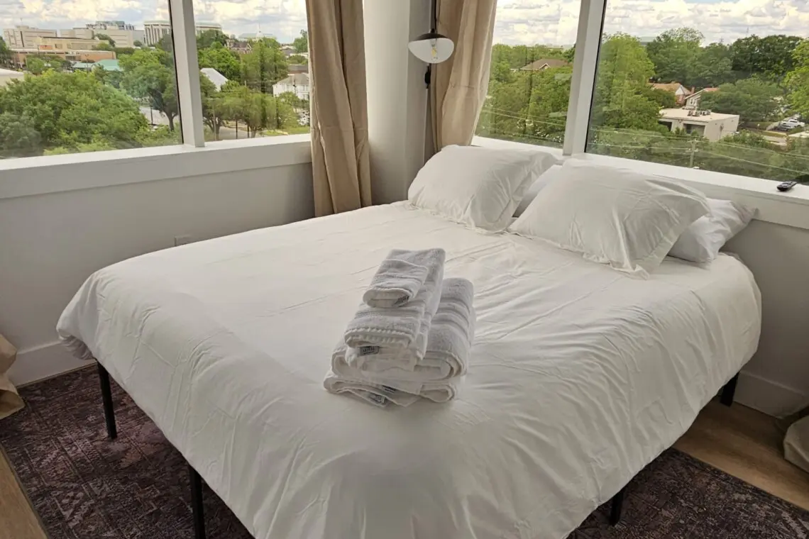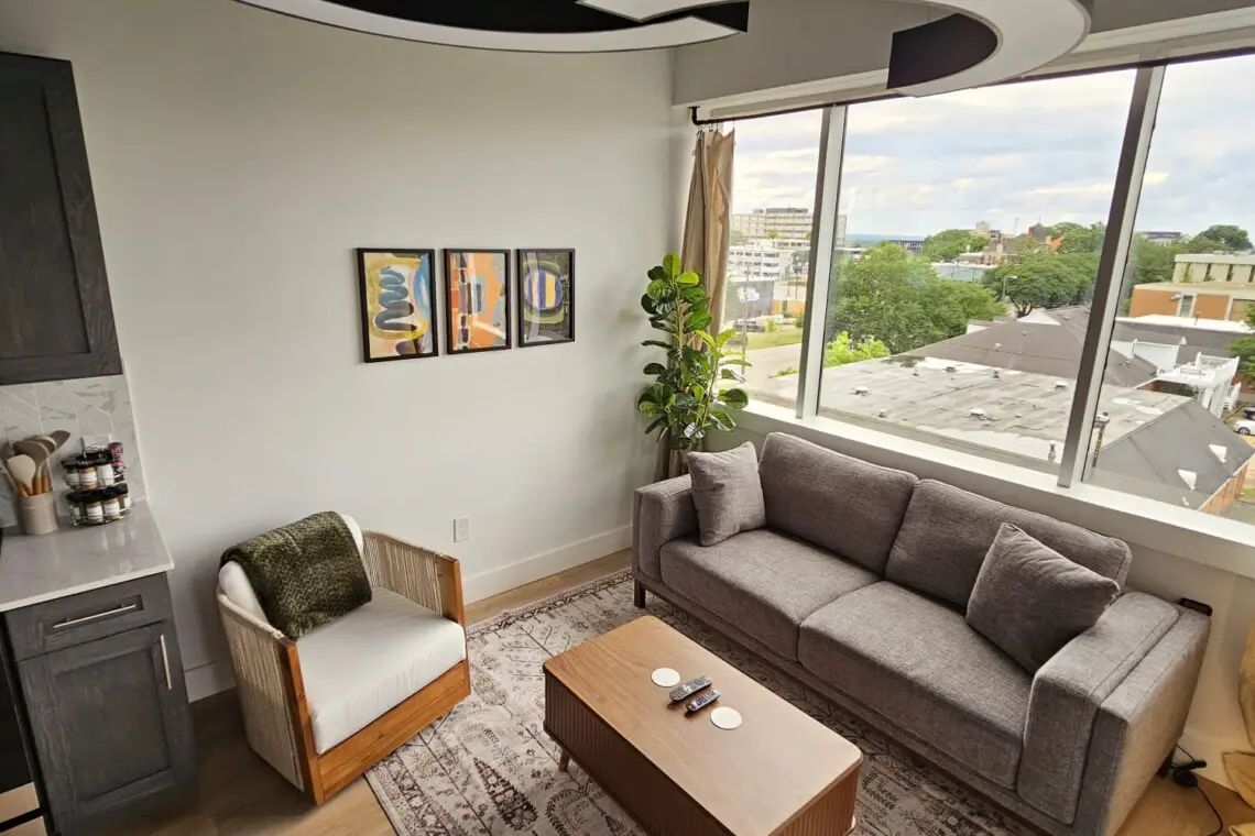 Step into comfort and style as you arrive at this beautifully designed downtown Montgomery apartment. Upon entering the front door, the elevator is conveniently located to your left. Ride up and step into a bright, thoughtfully curated space, where professional interior design and modern luxury set the tone for your stay.