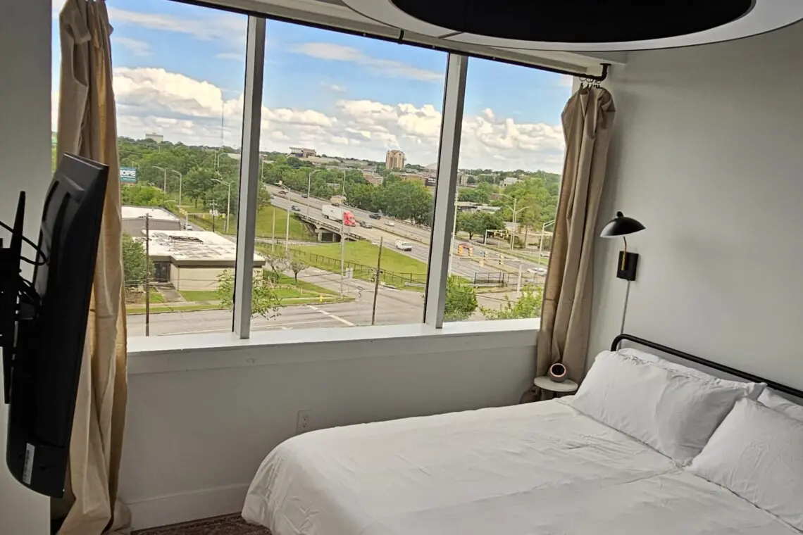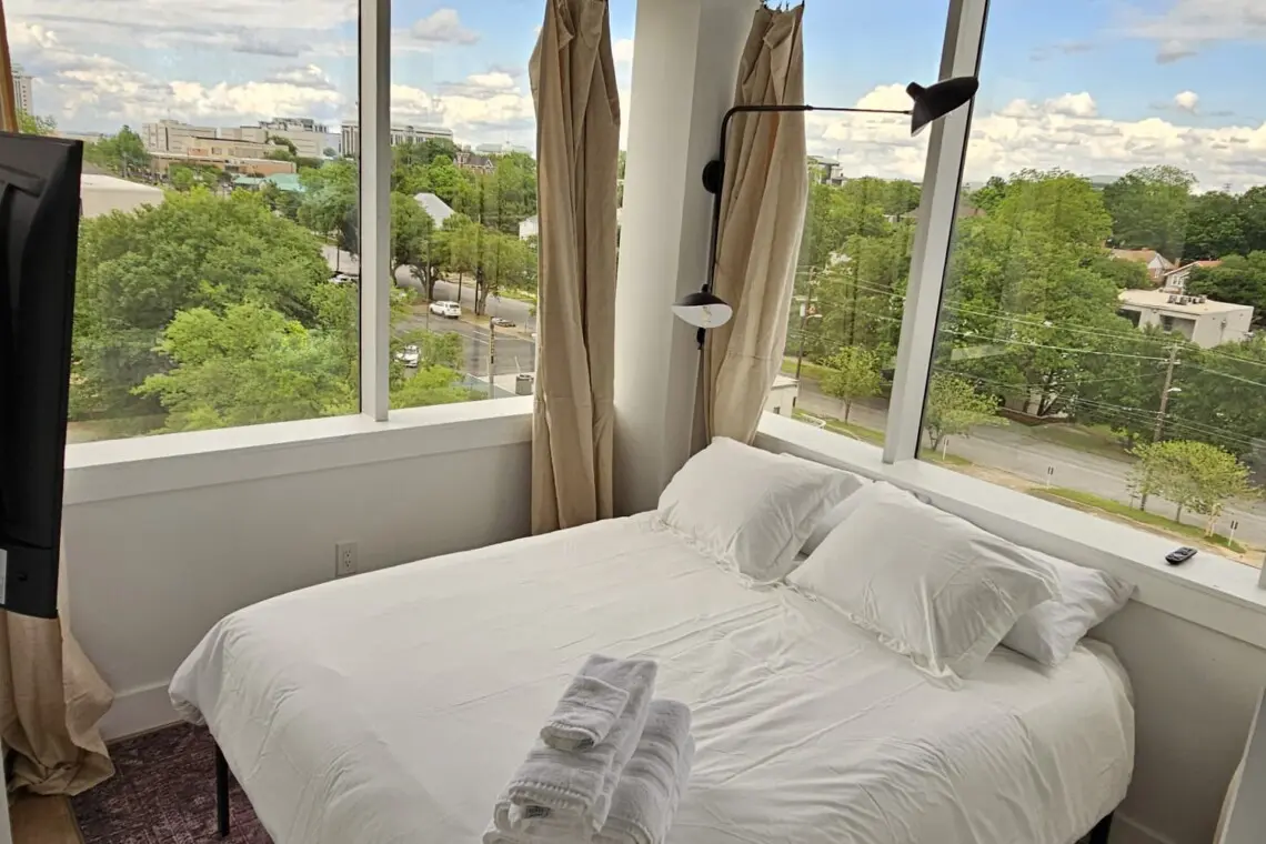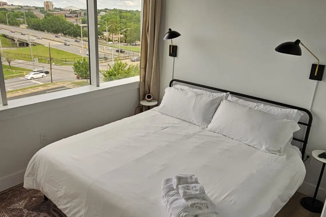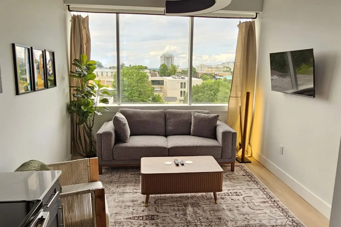 Further back, the inviting living room offers comfortable seating and a Smart TV, creating a relaxing place to gather, stream your favorite shows, or simply enjoy the view. Adjacent to the living area, the second bedroom includes a cozy queen bed, its own Smart TV, an ensuite bathroom, and sweeping views of downtown Montgomery, framed by floor-to-ceiling windows.
