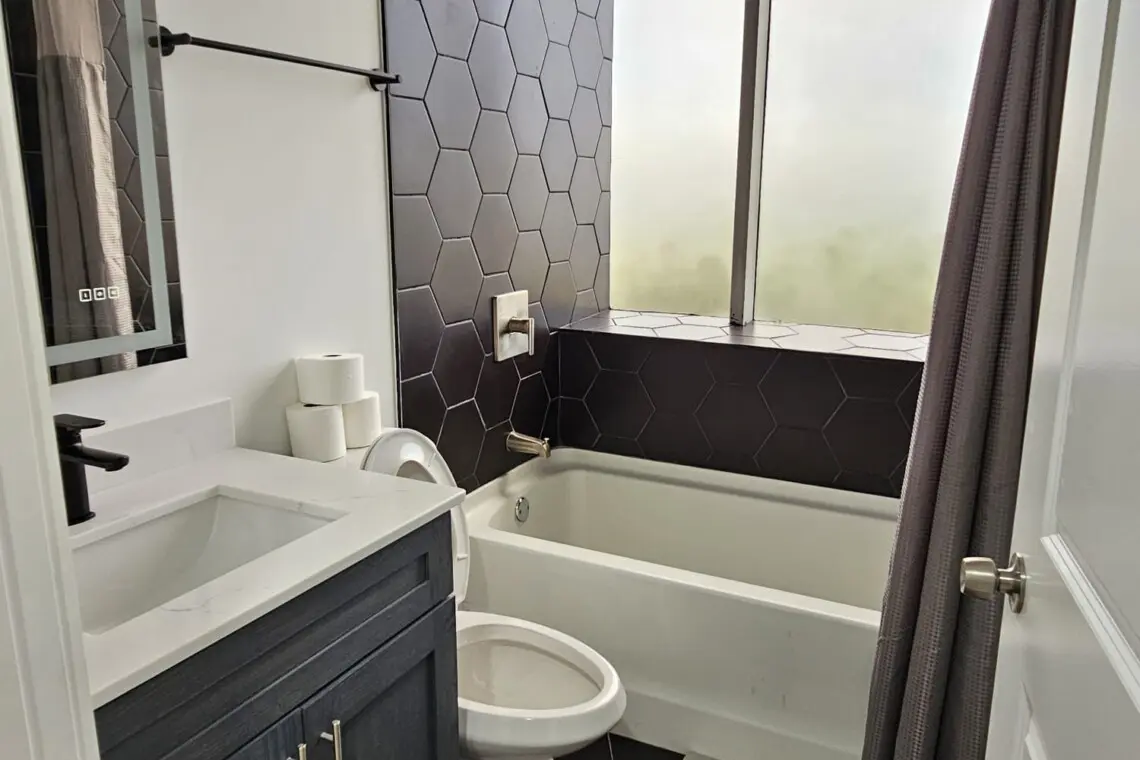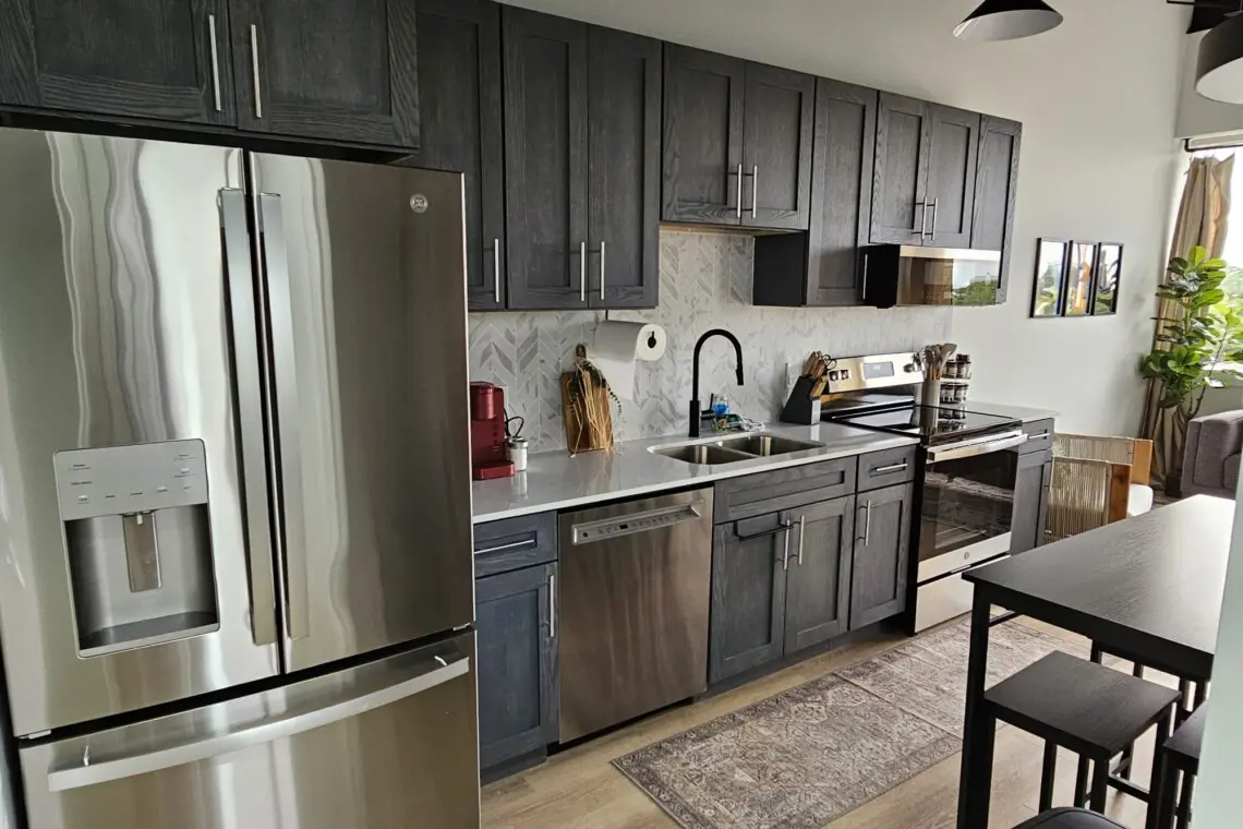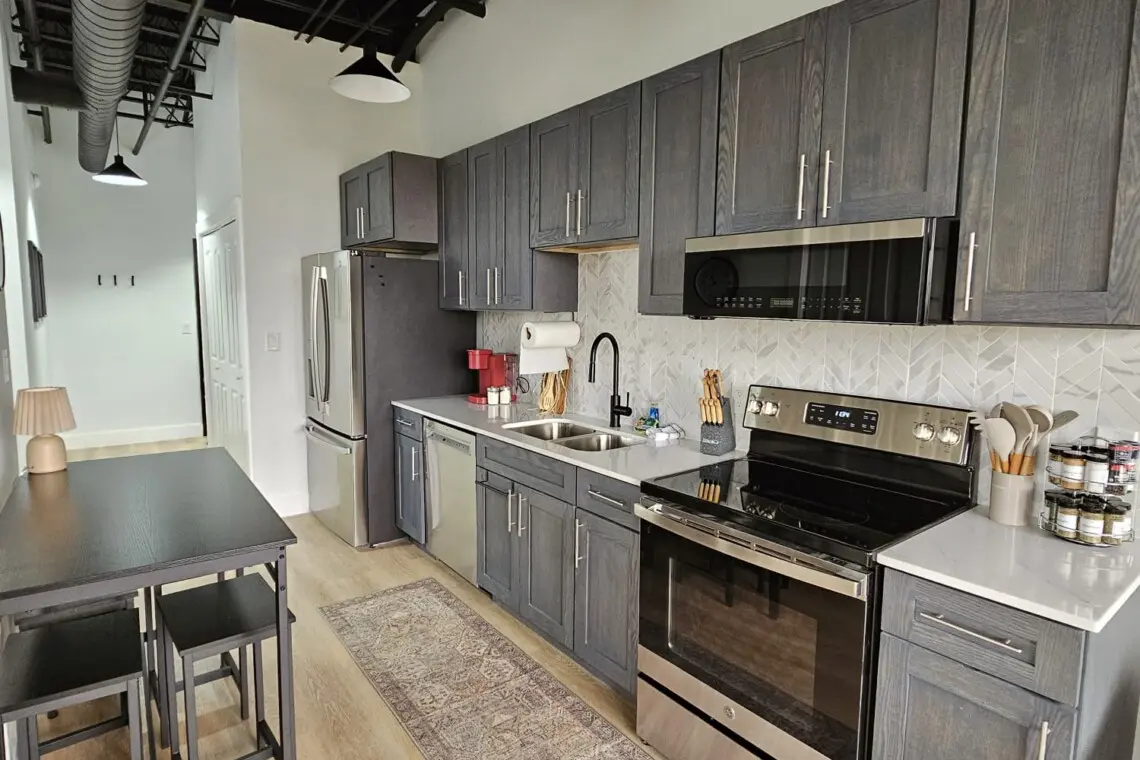 The entryway opens into a sleek kitchen outfitted with stainless steel appliances and granite countertops, making it easy to whip up a quick breakfast or a full meal. Just to the right, the first bedroom features a plush king bed and access to a hallway bathroom with a tub and shower combo — ideal for unwinding after a busy day.