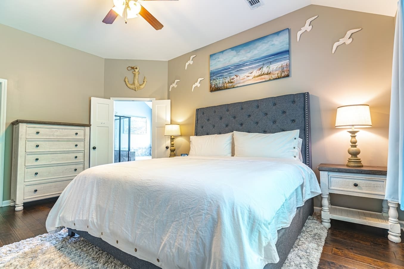 As you venture into the bedrooms, you’ll be greeted with the ultimate comfort. Each room features a king-sized bed, ensuring a restful night’s sleep after a day of adventures or work. The walk-in closets provide ample space to organize your wardrobe, and the hardwood floors throughout the property exude elegance and sophistication.