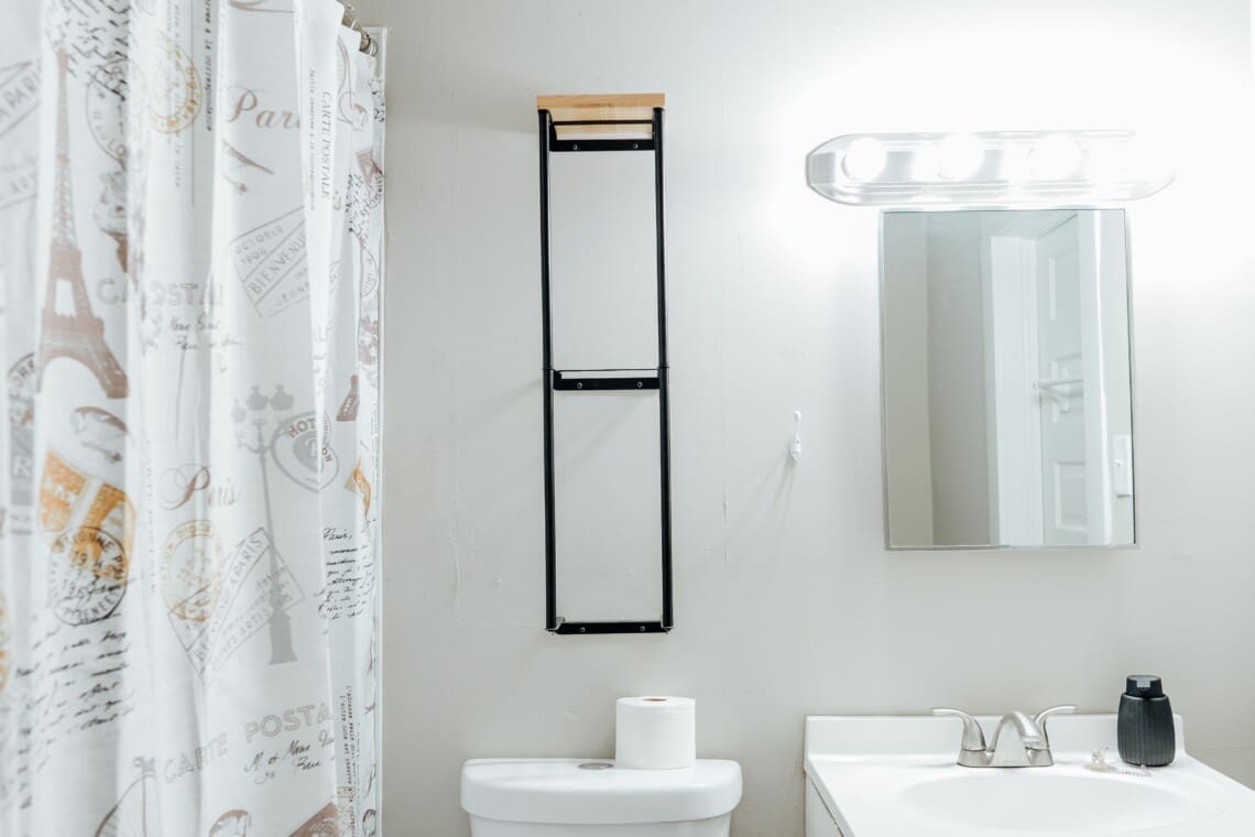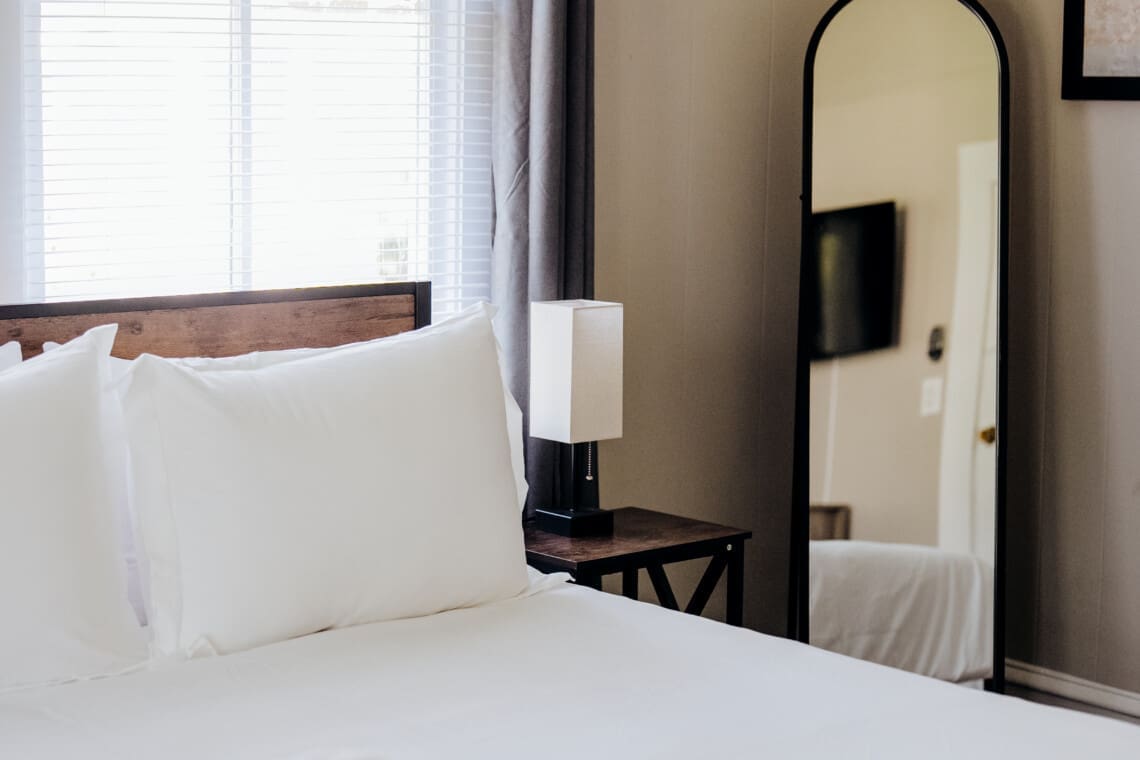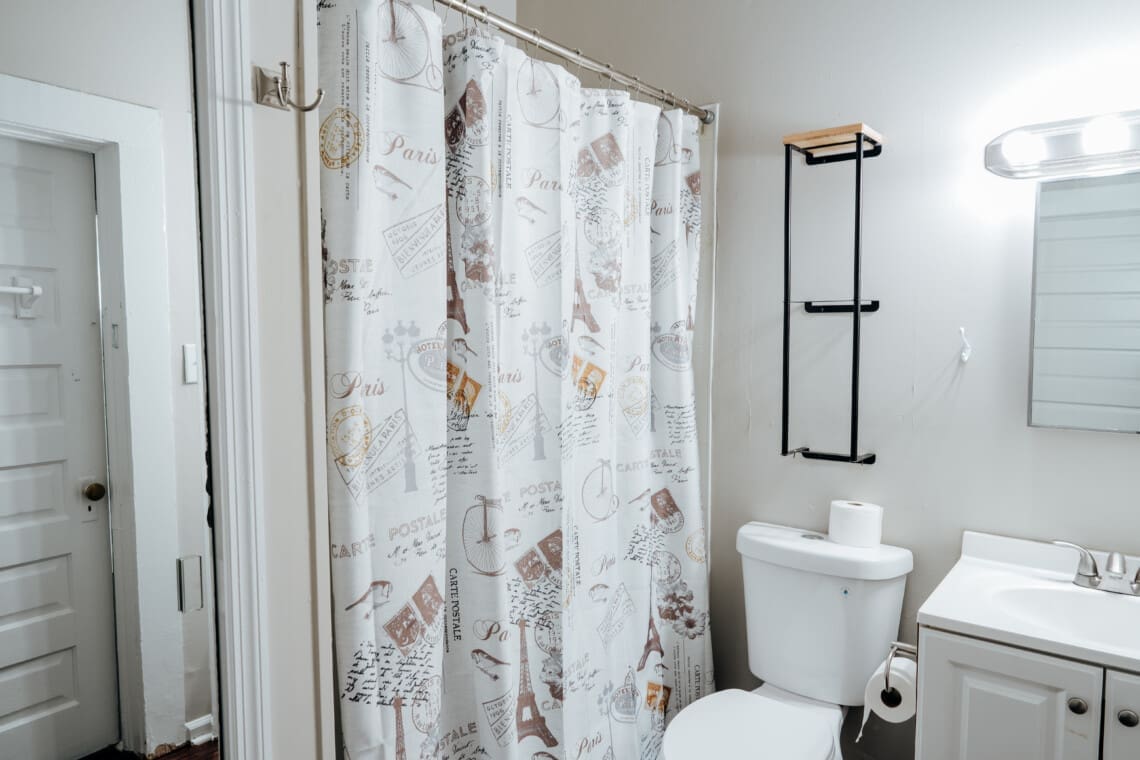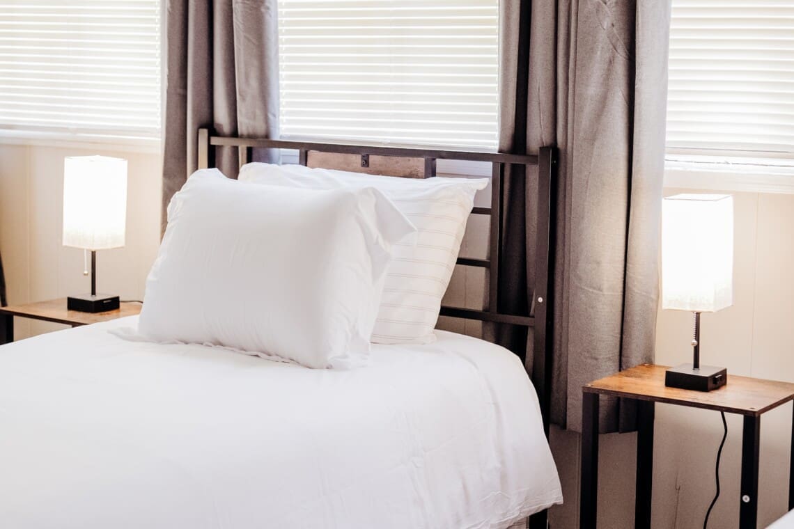 Just off the dining room to the left is the king bedroom. To the right, there’s a bathroom with a shower/tub combo. This bathroom also connects to a hallway that leads to the twin bedroom and the kitchen.
