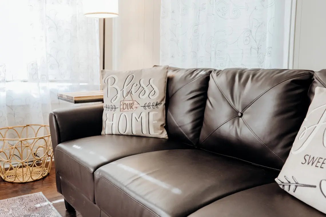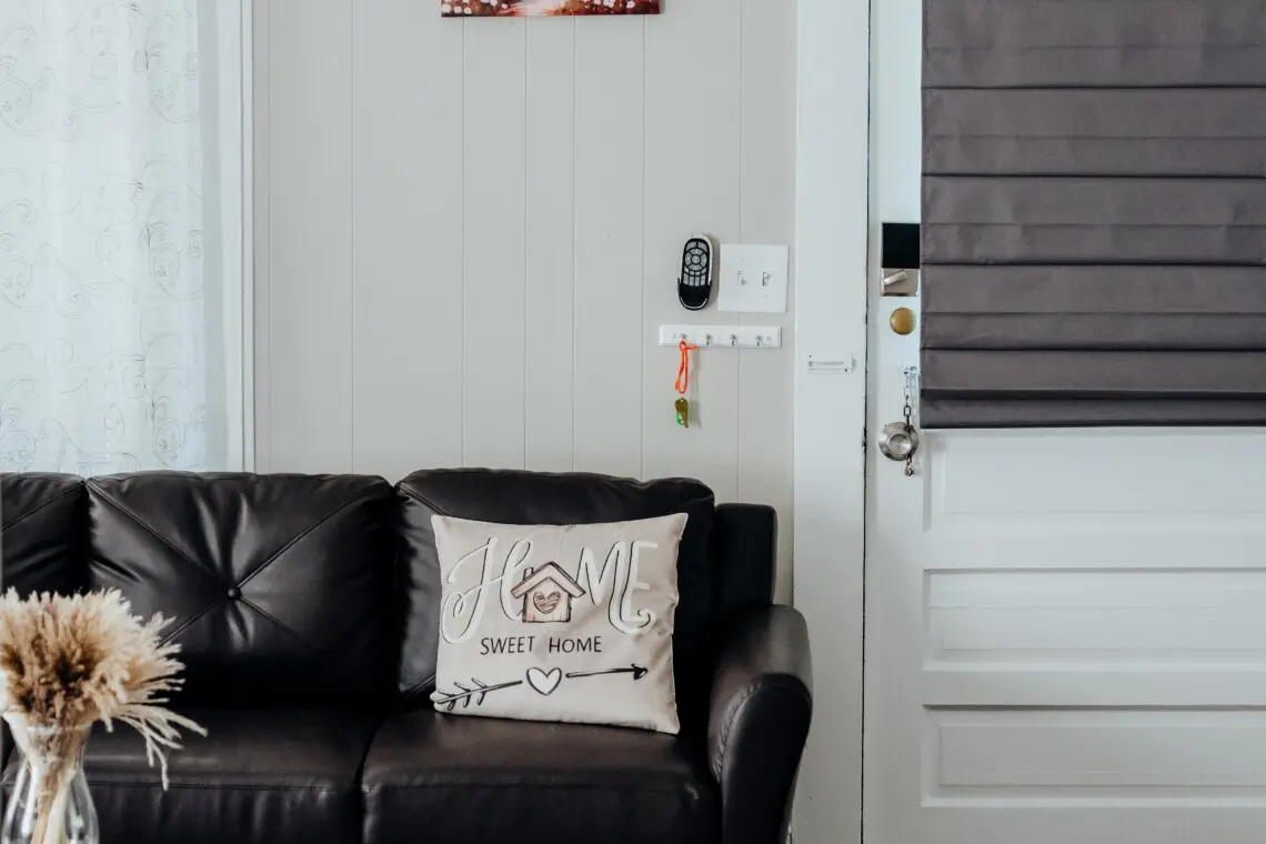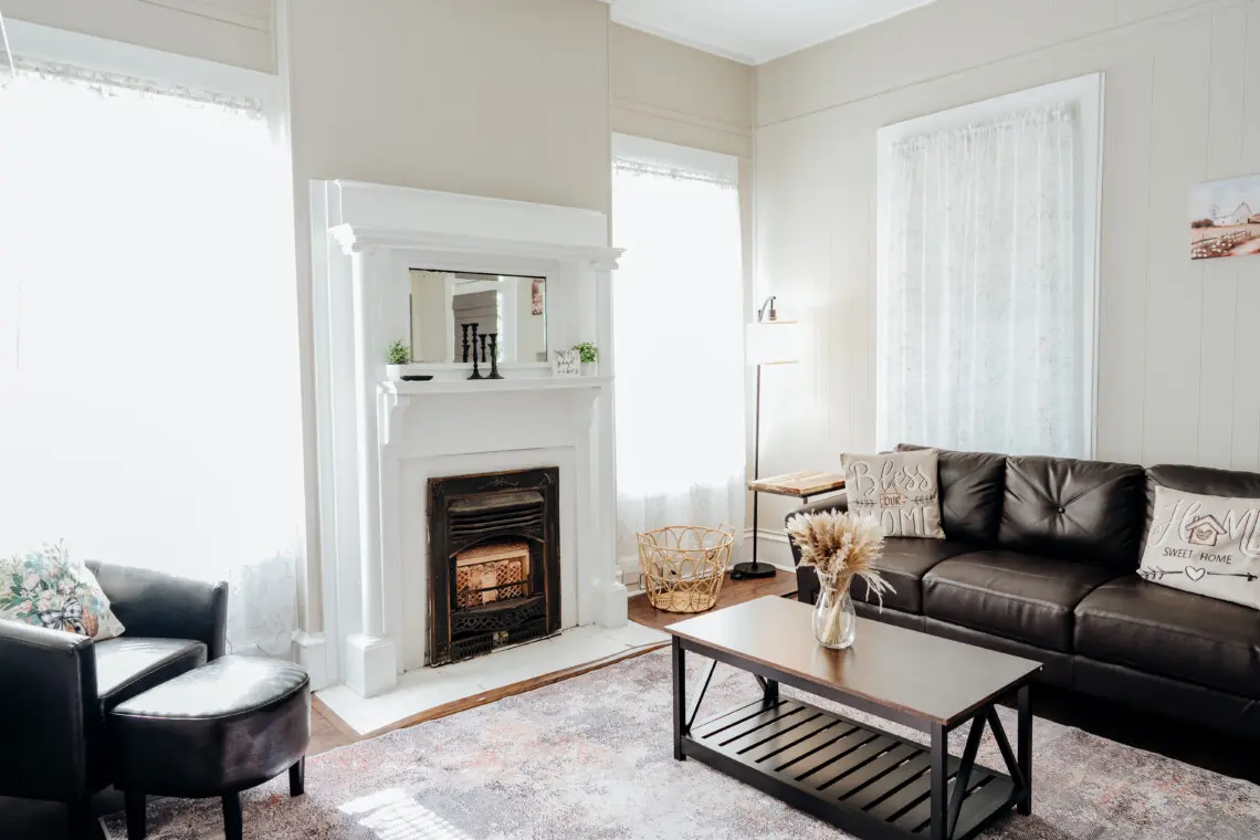 Welcome! When you walk in the front door, you’ll enter the cozy living room with a comfy couch, coffee table, and smart TV, perfect for relaxing.