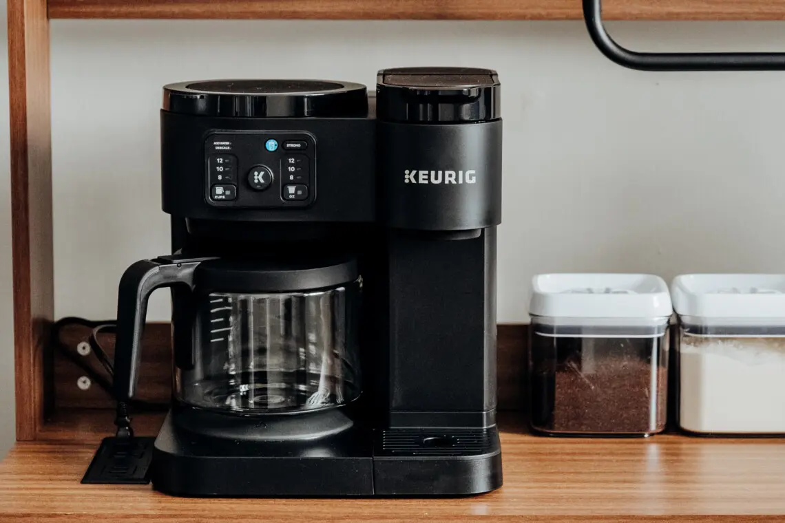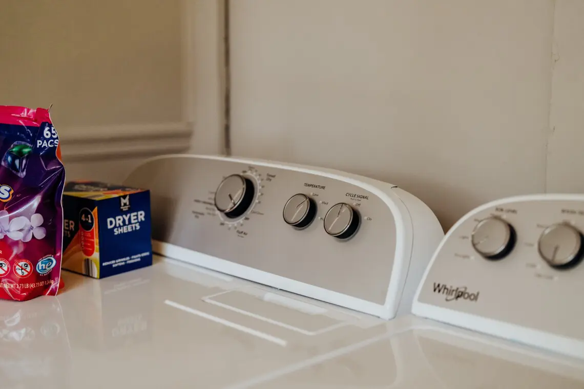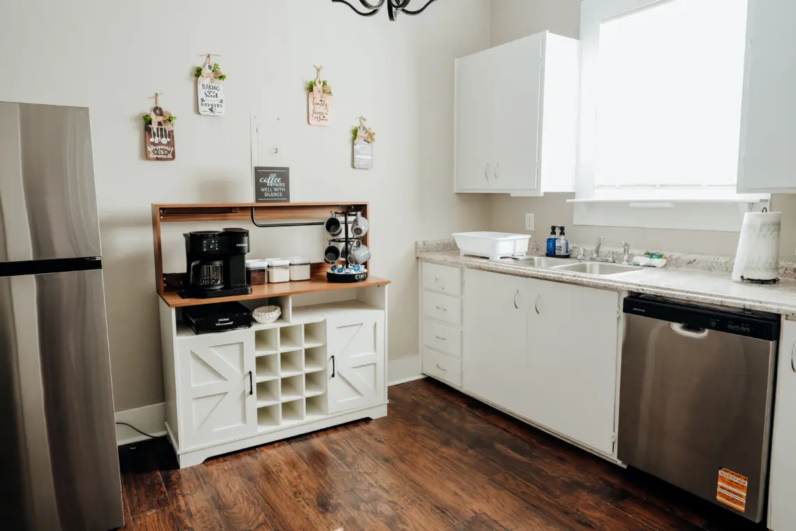 The kitchen is fully stocked with a refrigerator, microwave, stove, coffee maker, and more. Off to the left of the kitchen is the laundry room, which includes a washer, dryer, and a second bathroom with a stand-up shower.
