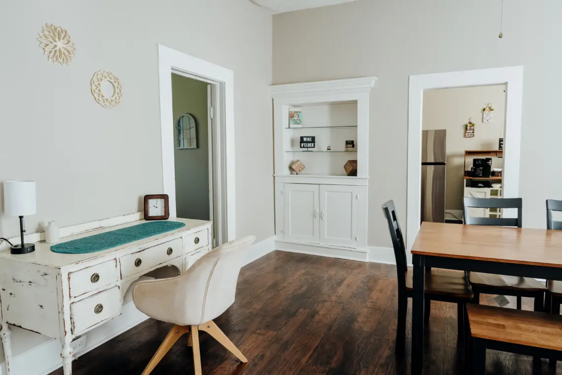 To the left of the living room is the queen bedroom. Straight ahead is the dining area, which features a table for six and a dedicated workspace if you need to get some work done.