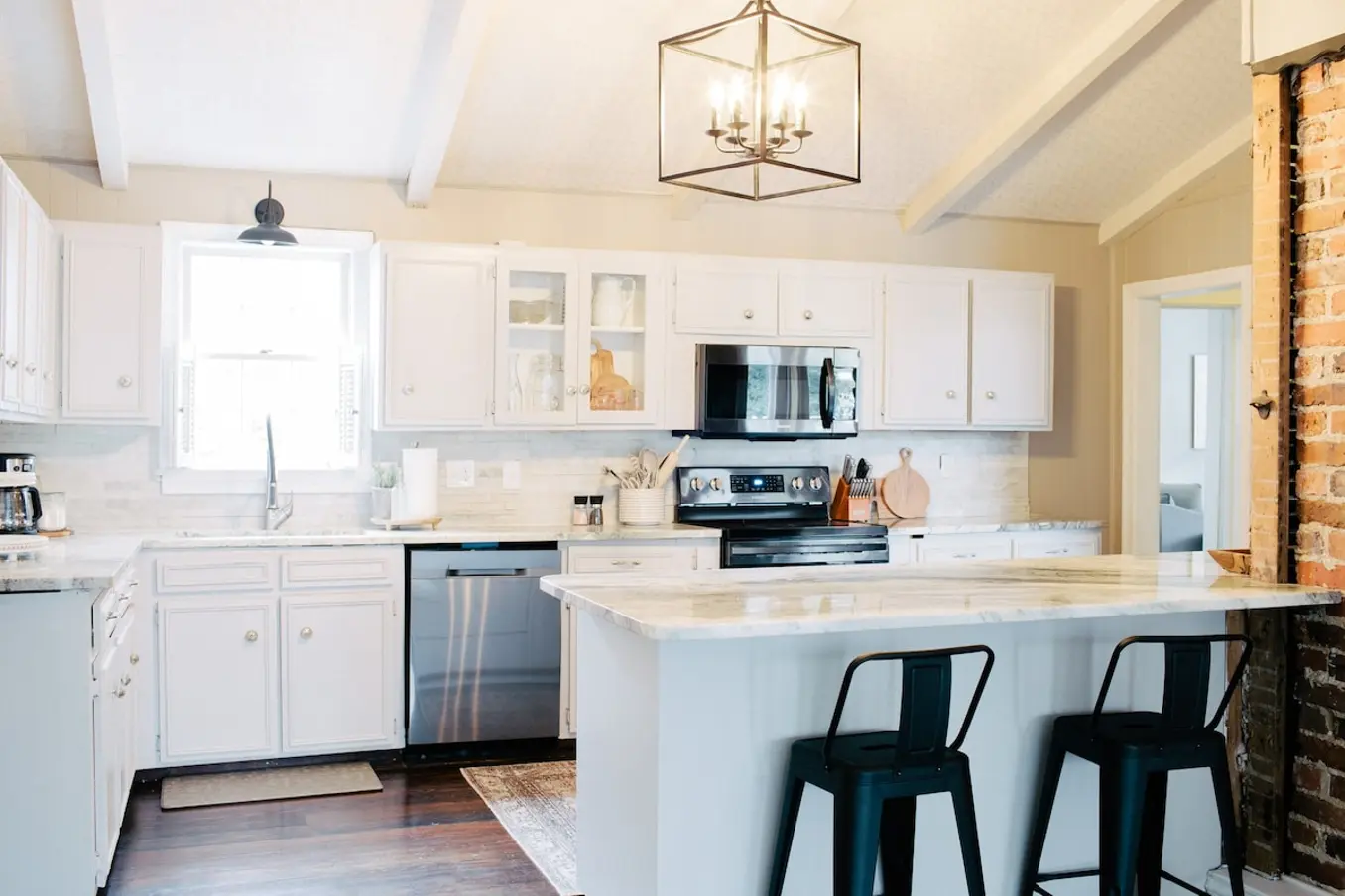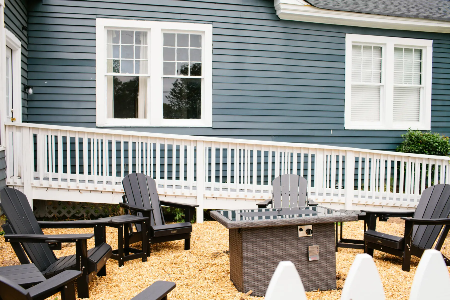 The kitchen and bathrooms in the main house feature luxurious granite counters and stainless steel appliances, blending modern convenience with historic charm. Prepare delicious meals for your group in the well-equipped kitchen, and gather around the large dining room table that can comfortably seat 12 guests. The main house also includes a kids’ playroom, ensuring the little ones are entertained and having a blast.