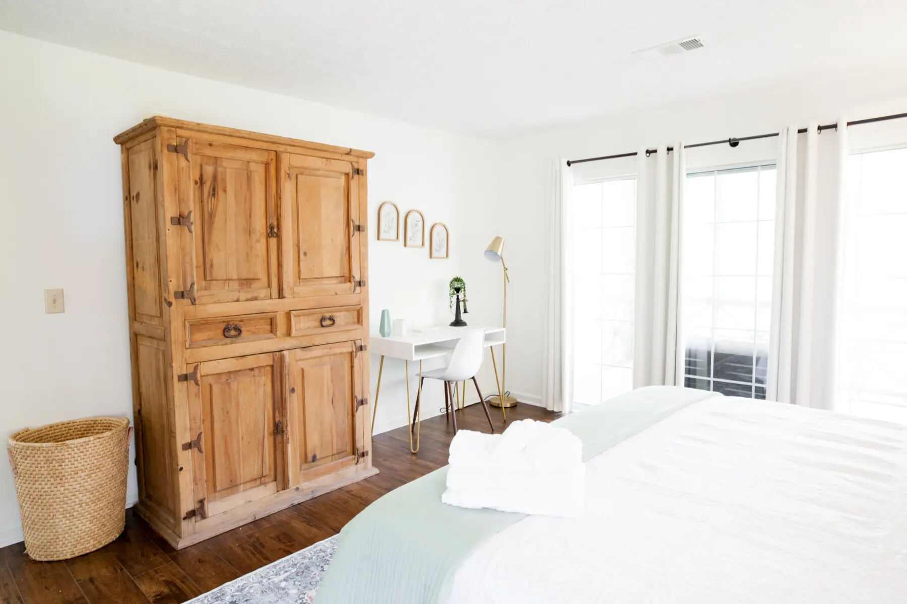 Luxurious Sleeping Arrangements: Unwind in the master bedroom, furnished with a plush king-sized bed for a restful night’s sleep after a day of lakeside adventures.