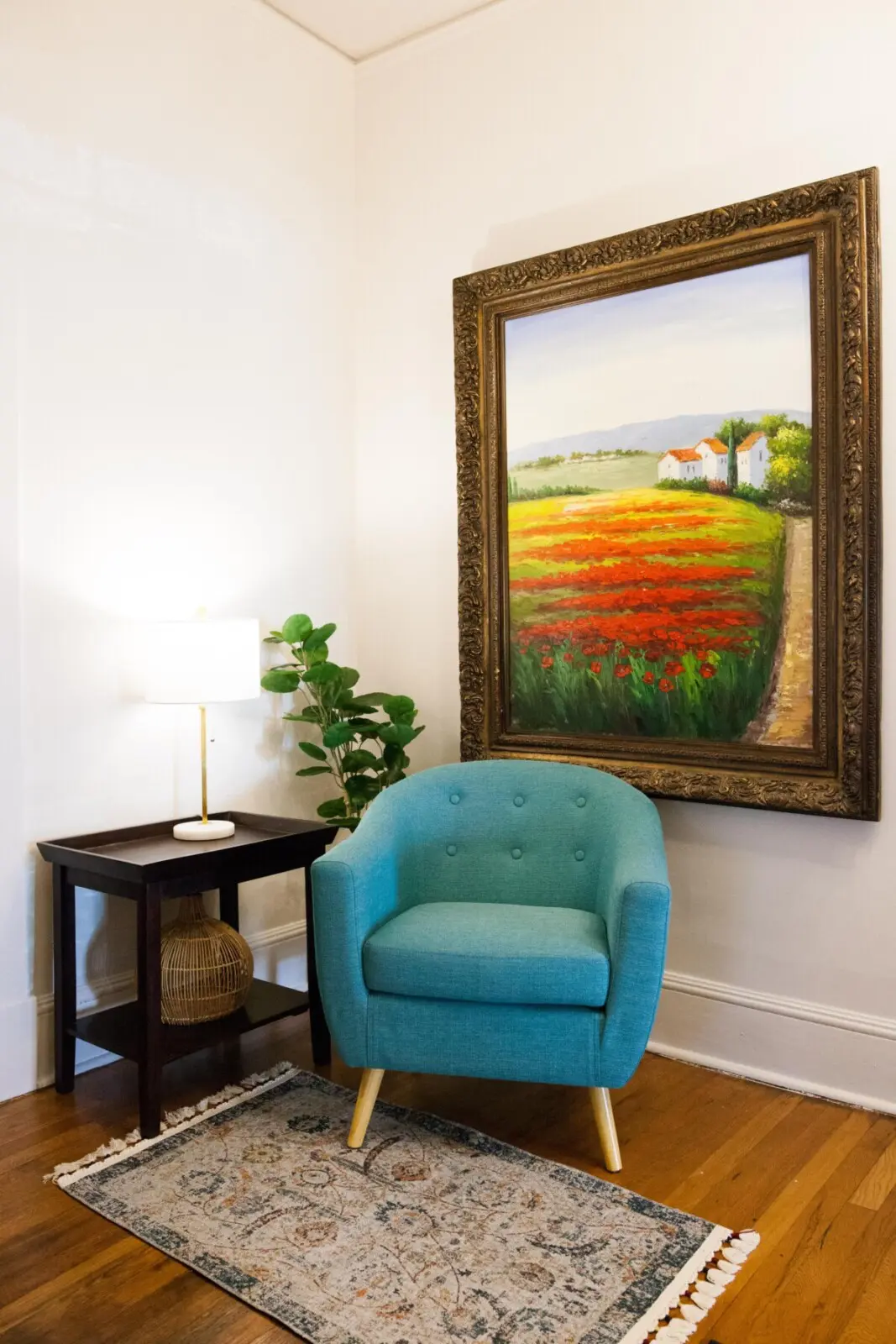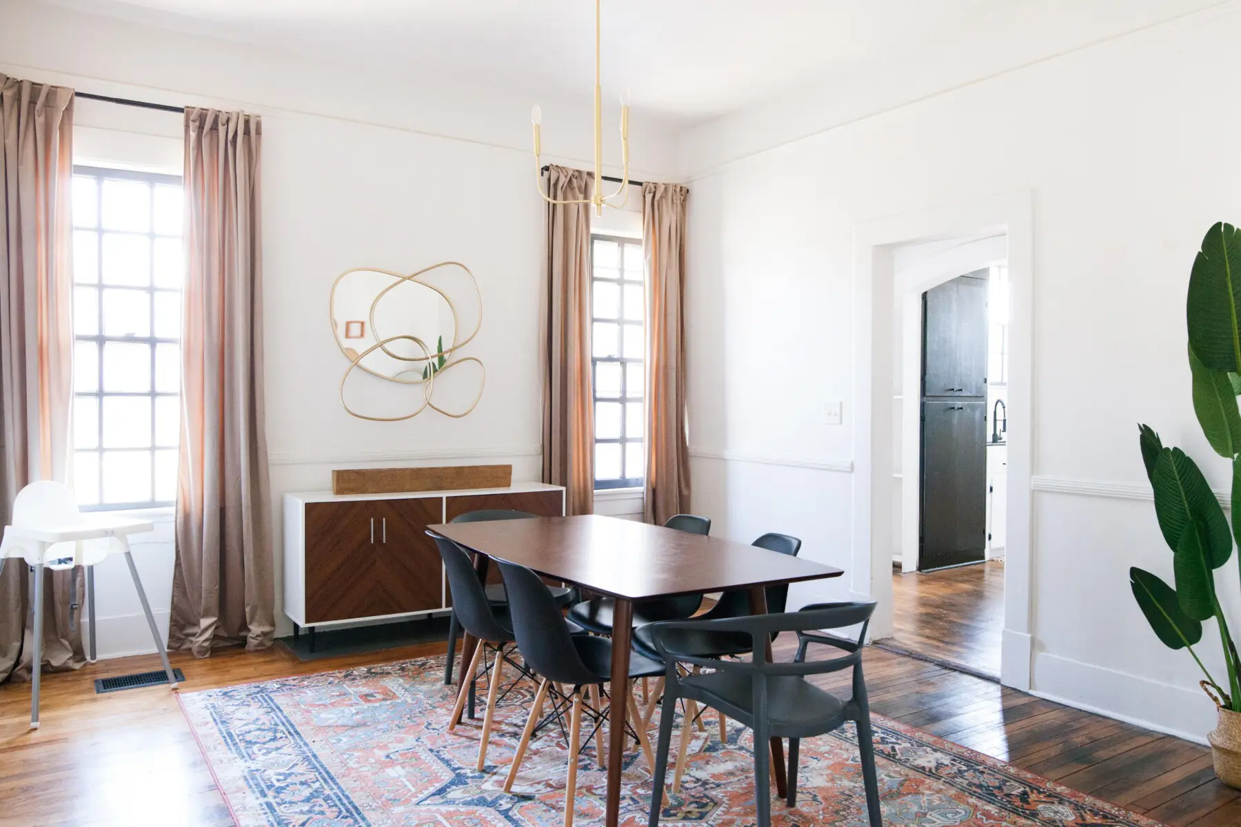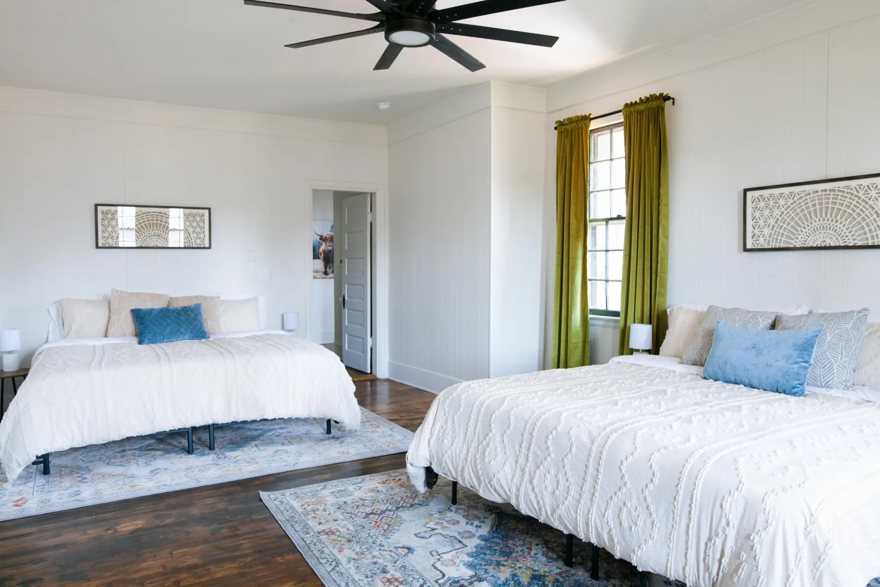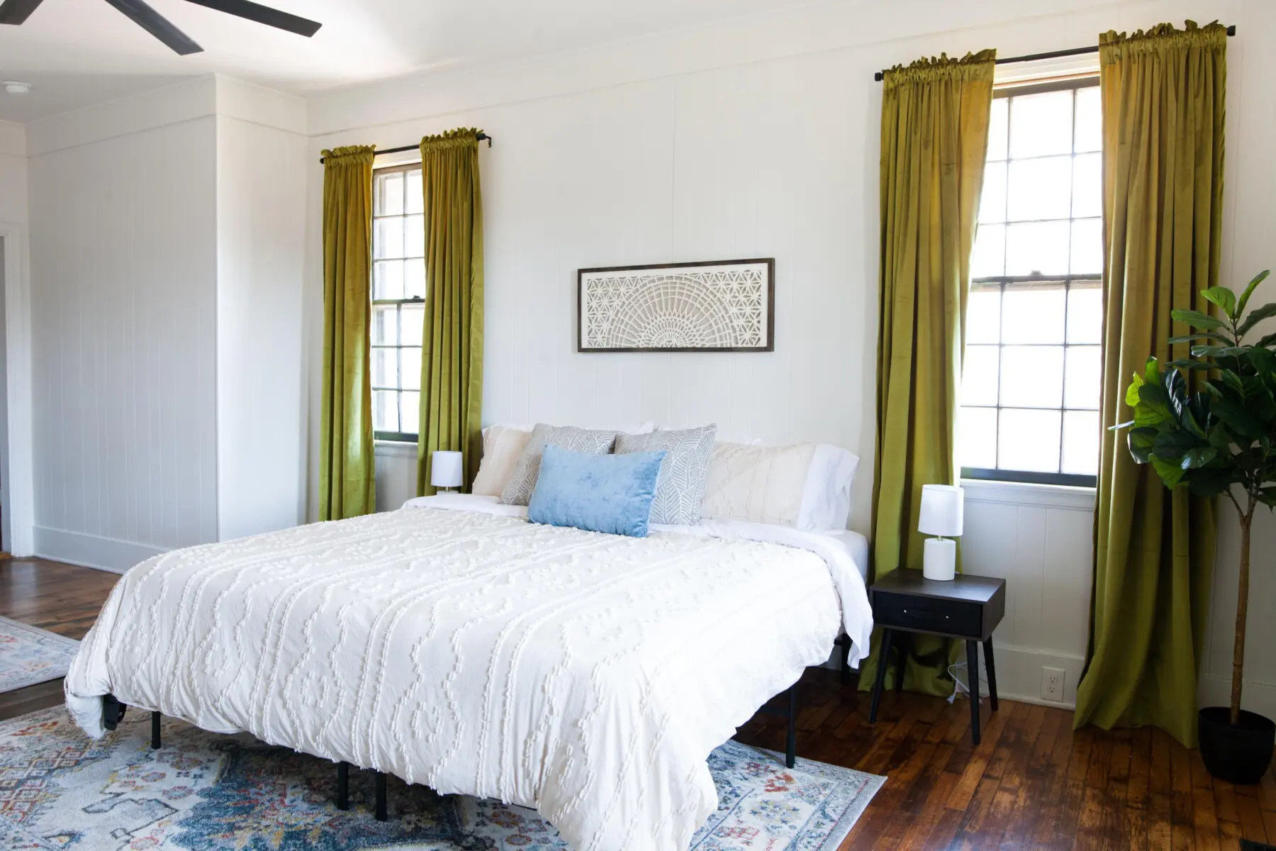 This home is decorated in a modern eclectic feel with thick velvet curtains and plush couches. We’ve got plenty of room for a number of guests in these huge bedrooms. We went with stainless appliances and preserved the original countertops in the kitchen. The home is equipped with an office with a convertible futon for those late nights. The backyard is fully fenced allowing for plenty of space for your pets and children to enjoy.
