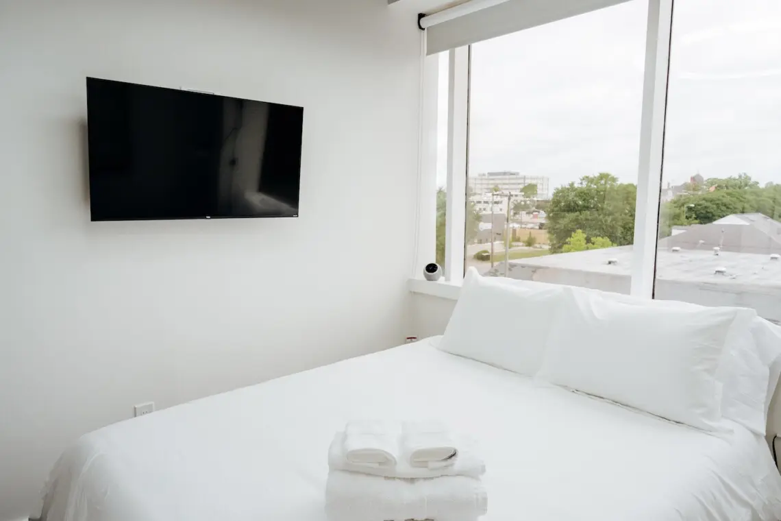 Further back, the inviting living room offers comfortable seating and a Smart TV, creating a relaxing place to gather, stream your favorite shows, or simply enjoy the view. Adjacent to the living area, the second bedroom includes a cozy queen bed, its own Smart TV, an ensuite bathroom, and sweeping views of downtown Montgomery, framed by floor-to-ceiling windows.